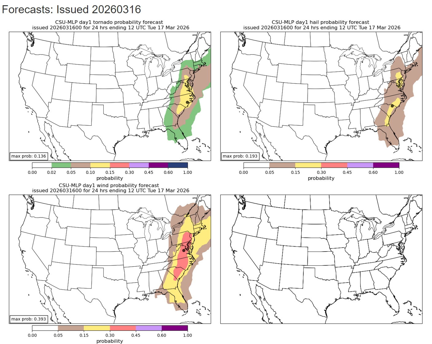 Day 1 Convective Outlook NWS Storm Prediction Center Norman OK 1226 AM CDT Mon Mar 16 2026 Valid 161200Z - 171200Z ...THERE IS A MODERATE RISK OF SEVERE THUNDERSTORMS THIS AFTERNOON ACROSS PARTS OF CENTRAL MARYLAND...MUCH OF CENTRAL AND EASTERN VIRGINIA...CENTRAL NORTH CAROLINA AND ADJACENT PORTIONS OF SOUTH CAROLINA... ...SUMMARY... Fast moving thunderstorms may become widespread and accompanied by the risk for damaging wind gusts and a few tornadoes across the Mid Atlantic today. There is potential that a couple of storms could become capable of producing strong and long track tornadoes. ...Discussion... Models indicate that large-scale mid-level ridging will maintain amplitude across the Pacific coast through the Canadian Prairies and U.S. Rockies into early Tuesday and beyond. At the same time, it appears that downstream ridging will undergo further amplification just east of the Atlantic Seaboard, with only very slow eastward progression of large-scale troughing in between, across the Mississippi Valley into the Atlantic Seaboard. It does appear that one significant short wave perturbation will gradually pivot through the base of the troughing, toward the Cumberland Plateau during the day today, before rapidly accelerating northward near the Appalachians toward southwestern Quebec this evening through the overnight hours. Models suggest that this will eventually provide support for a rapidly deepening secondary surface cyclone across Quebec, downstream of an occluding and weakening cyclone across the lower Great Lakes vicinity. Surface troughing ahead of the trailing cold front is also forecast to undergo notable deepening to the east of the Allegheny Front and Blue Ridge today, and it appears that a rather sharp surface pressure fall/rise couplet will develop and overspread the northern Mid Atlantic coast late this afternoon and evening with the passage of the trough and trailing cold front. The cold front may clear all the Atlantic Seaboard, but perhaps portions of southern Florida and the Keys, by 12Z Tuesday. ...Atlantic Seaboard... Low-level moisture return is underway across the southern into middle Atlantic Seaboard. By early this afternoon, it appears that 60+ F surface dew points will advect as far north as the higher terrain of central through northeastern Pennsylvania, with dew points perhaps as high as the lower/mid 60s F across eastern North Carolina and Virginia. In advance of a pre-frontal squall line, which may be ongoing and beginning to spread to the lee of the southern Appalachians through the eastern Gulf Coast states at the outset of the period, it appears that destabilization and large-scale ascent may support scattered new thunderstorm development fairly early in the day. The extent to which this may impact further destabilization through late afternoon remains unclear. Destabilization may also be impacted by relatively warm air/weak lapse rates in mid/upper-levels, as models suggest that cold air aloft will tend to lag to the west of the surface cold front. Even so, forecast soundings suggest that, with breaks in the overcast, at least weak boundary-layer CAPE on the order of 500-1000 J/kg is possible in the warm sector across the Mid Atlantic. In the presence of very strong southwesterly deep-layer mean flow on the order of 50-60+ kt and strong to extreme low-level shear, including at least modest clockwise curvature, the environment appears potentially conducive to the evolution fast moving supercells with potential to produce strong tornadoes. Barring much interference from other storms, which remains uncertain at this time, at least a couple of these could become long track, given the storm motions. Otherwise, trailing this activity, the lee surface trough/cold front might become a focus for a developing line of storms capable of promoting the downward transfer of momentum with potential to produce widespread damaging wind gusts. Farther south, it appears that the initial squall line may be maintained or re-intensify, with a continuing risk for strong to severe wind gusts and potential for tornadoes into and across the southern Atlantic coast. ..Kerr/Thornton.. 03/16/2026
