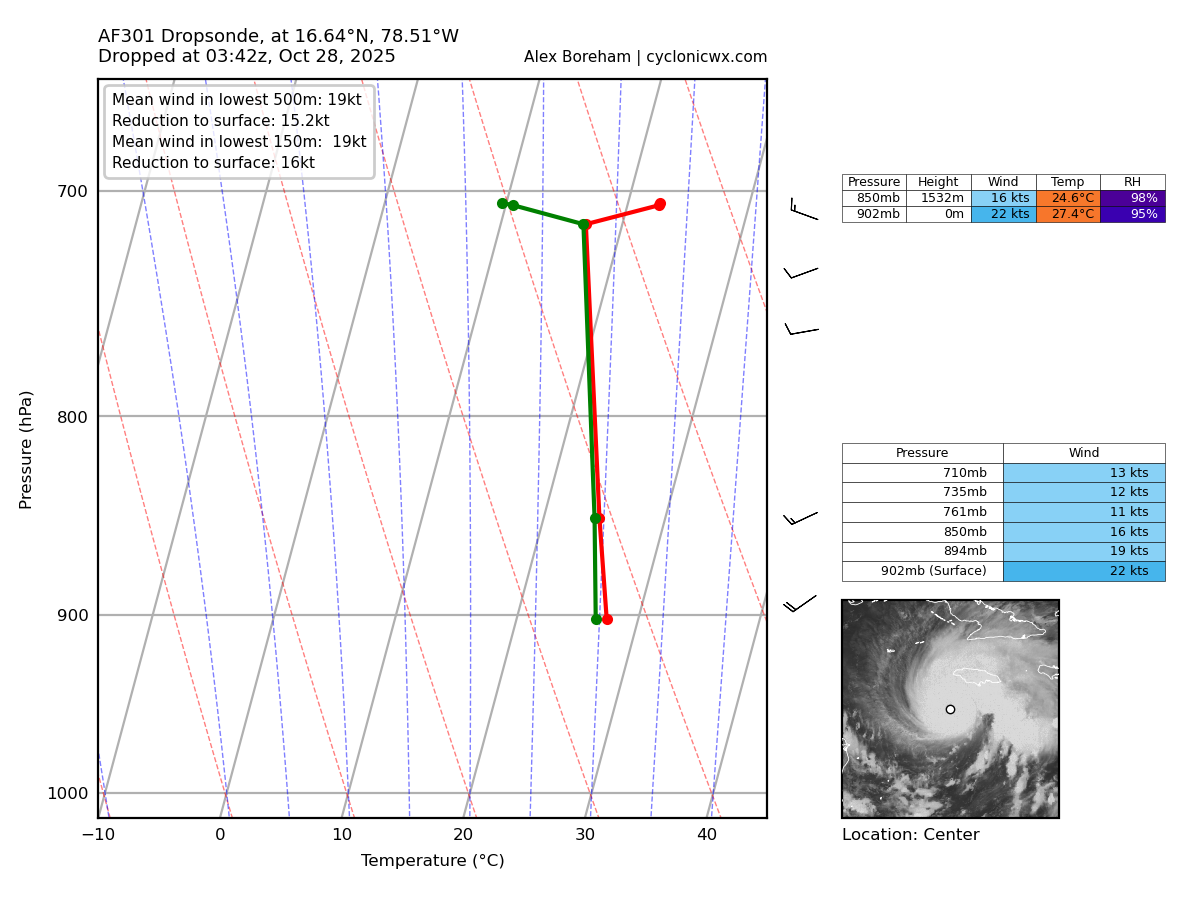 Likely the last VDM of the night. The eye size has been remarkably consistent. Product: Air Force Vortex Message (URNT12 KNHC)Transmitted: 28th day of the month at 5:02ZAgency: United States Air ForceAircraft: Lockheed WC-130J Hercules with reg. number AF96-5301Storm Name: MelissaStorm Number & Year: 13 in 2025 (flight in the North Atlantic basin)Mission Number: 22Observation Number: 36 ( See all messages of this type for this mission. )A. Time of Center Fix: 28th day of the month at 4:36:00ZB. Center Fix Coordinates: 16.73N 78.49WB. Center Fix Location: 142 statute miles (229 km) to the SW (231°) from Kingston, Jamaica.C. Minimum Height at Standard Level: 2,236m (7,336ft) at 700mbD. Minimum Sea Level Pressure: 903mb (26.67 inHg)E. Dropsonde Surface Wind at Center: From 185° at 11kts (From the S at 13mph)F. Eye Character: ClosedG. Eye Shape & Diameter: Circular with a diameter of 10 nautical miles (12 statute miles)H. Estimated (by SFMR or visually) Maximum Surface Wind Inbound: 156kts (179.5mph)I. Location & Time of the Estimated Maximum Surface Wind Inbound: 4 nautical miles to the N (8°) of center fix at 4:34:30ZJ. Maximum Flight Level Wind Inbound: From 99° at 149kts (From the E at 171.5mph)K. Location & Time of the Maximum Flight Level Wind Inbound: 5 nautical miles to the N (6°) of center fix at 4:34:00ZL. Estimated (by SFMR or visually) Maximum Surface Wind Outbound: 157kts (180.7mph)M. Location & Time of the Estimated Maximum Surface Wind Outbound: 6 nautical miles to the SSE (150°) of center fix at 4:38:00ZN. Maximum Flight Level Wind Outbound: From 242° at 162kts (From the WSW at 186.4mph)O. Location & Time of the Maximum Flight Level Wind Outbound: 6 nautical miles to the SSE (150°) of center fix at 4:38:00ZP. Maximum Flight Level Temp & Pressure Altitude Outside Eye: 12°C (54°F) at a pressure alt. of 3,054m (10,020ft)Q. Maximum Flight Level Temp & Pressure Altitude Inside Eye: 23°C (73°F) at a pressure alt. of 3,058m (10,033ft)R. Dewpoint Temp (collected at same location as temp inside eye): 12°C (54°F)R. Sea Surface Temp (collected at same location as temp inside eye): Not AvailableS. Fix Determined By: Penetration, Radar, Wind, Pressure and TemperatureS. Fix Level: 700mbT. Navigational Fix Accuracy: 0.02 nautical milesT. Meteorological Accuracy: 1 nautical mileRemarks Section: Maximum Flight Level Wind: 165kts (~ 189.9mph) which was observed 7 nautical miles to the ENE (58°) from the flight level center at 3:47:00Z -