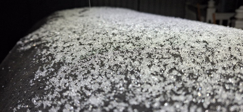 Snowing moderately and accumulating. Temp is 32.6