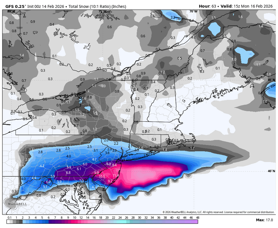 10. I'm in Boston until Monday so it's guaranteed to hit NYC/LI when I'm away. And make for a disaster when I'm driving home. Looks here like it did at home a week ago roughly with the snowcover.
