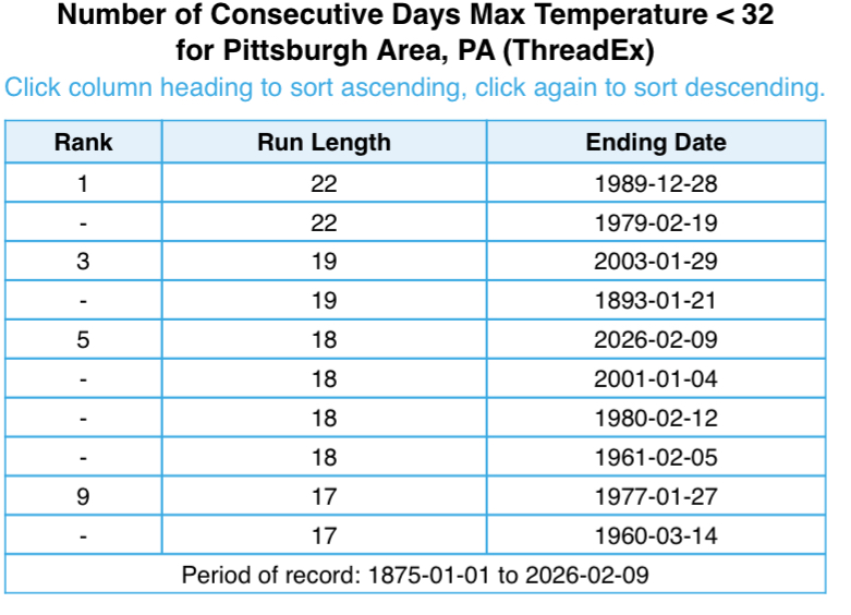 And so ends the sub-freezing streak, with 18 days in a row staying entirely below 32 (the famous 1976-77 streak had a day in the middle of the streak hit exactly 32), this is good for 5th all time. -