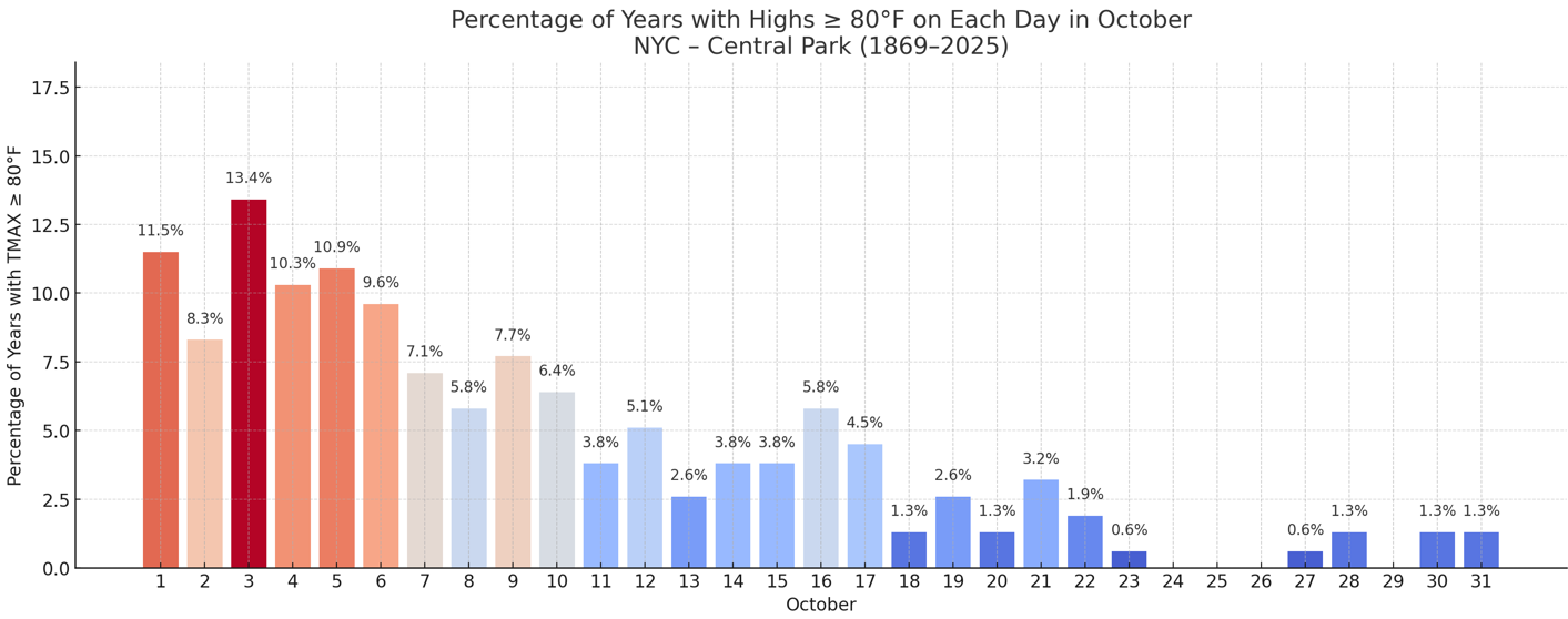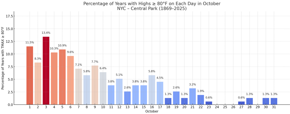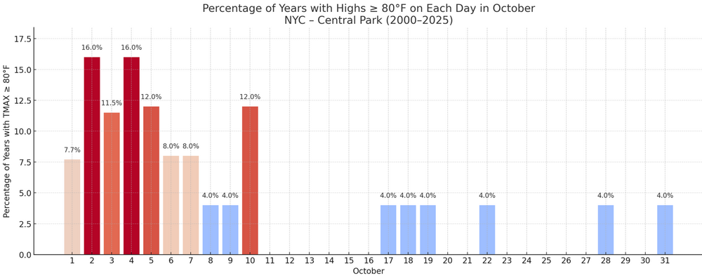 Frequency of 80° or above highs at Central Park: 1869-2025: 2000-2025: Note: October 4-31 is from 1869-2024.