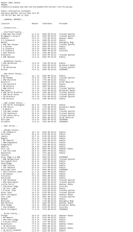706 SXUS71 KBOX 240003 RERPVD RECORD EVENT REPORT NATIONAL WEATHER SERVICE BOSTON/NORTON, MA 700 PM EST MON FEB 23 2026 ...RECORD SNOWSTORM FOR PROVIDENCE RI... THE BLIZZARD OF 2026 BROKE SEVERAL SNOWFALL RECORDS AT RHODE ISLAND T.F. GREEN INTERNATIONAL AIRPORT IN PROVIDENCE: - STORM TOTAL SNOWFALL OF 37.9 INCHES BROKE THE RECORD FOR THE GREATEST SINGLE SNOWSTORM ON RECORD, WHICH WAS 28.6 INCHES SET DURING THE BLIZZARD OF `78, ON FEBRUARY 6-7, 1978. - DAILY SNOWFALL OF 35.5 INCHES BROKE THE RECORD ONE-DAY SNOWFALL, WHICH WAS 19.0 INCHES SET DURING THE BLIZZARD OF `96, ON JANUARY 8, 1996. - FINALLY, THE DAILY SNOWFALL OF 35.5 INCHES BROKE THE RECORD SNOWFALL FOR FEBRUARY 23, WHICH WAS JUST 3.8 INCHES IN 1967. A FINAL UPDATE WILL BE SENT JUST AFTER MIDNIGHT. $$ JWD/KJC -