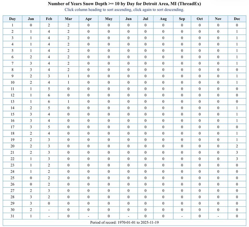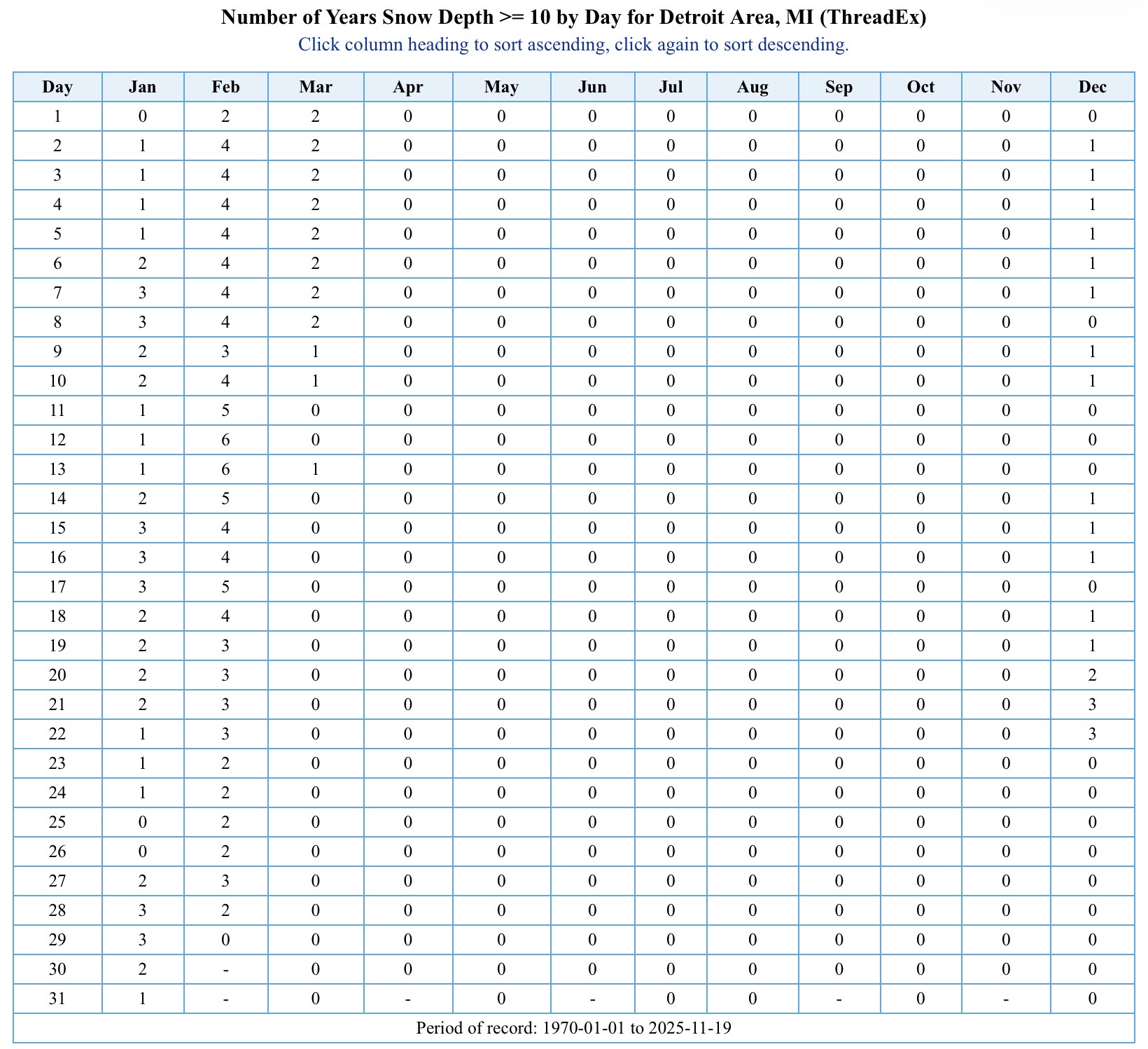 I went back to 1970 and calculated the amount of years Detroit had a 10”+ pack on each calendar day. They don’t frequently see a 10”+ pack, but it did warm my heart to see a spike the week before Christmas. -