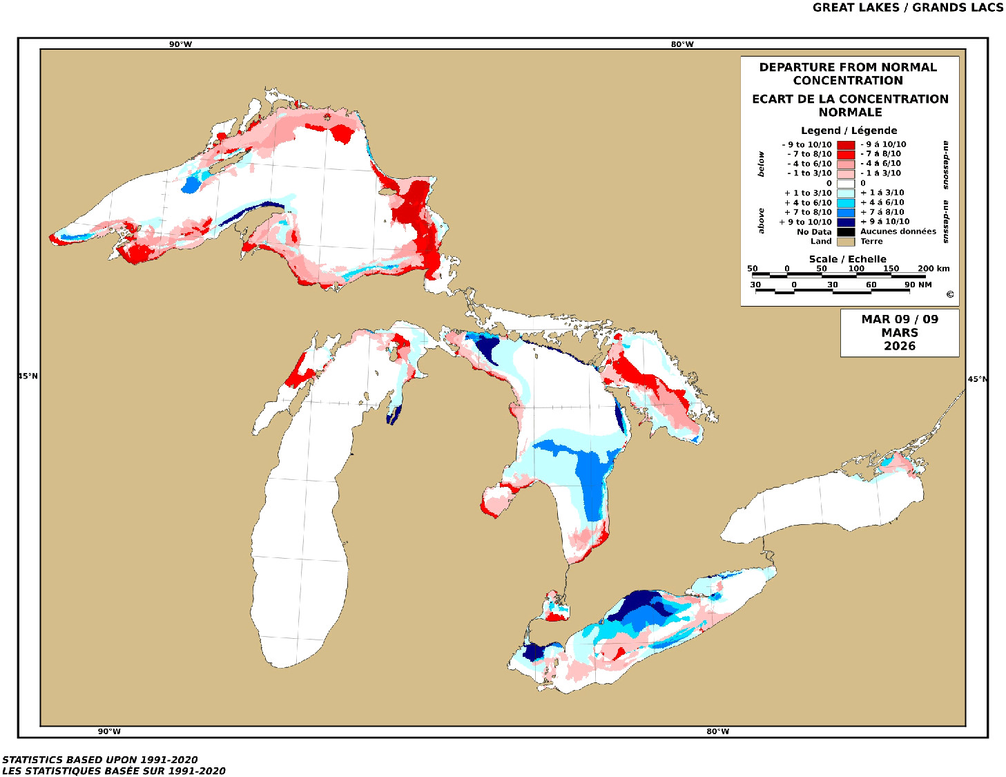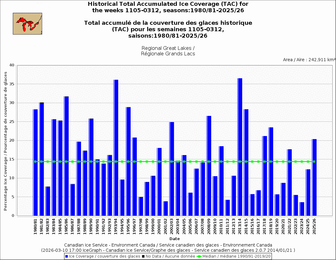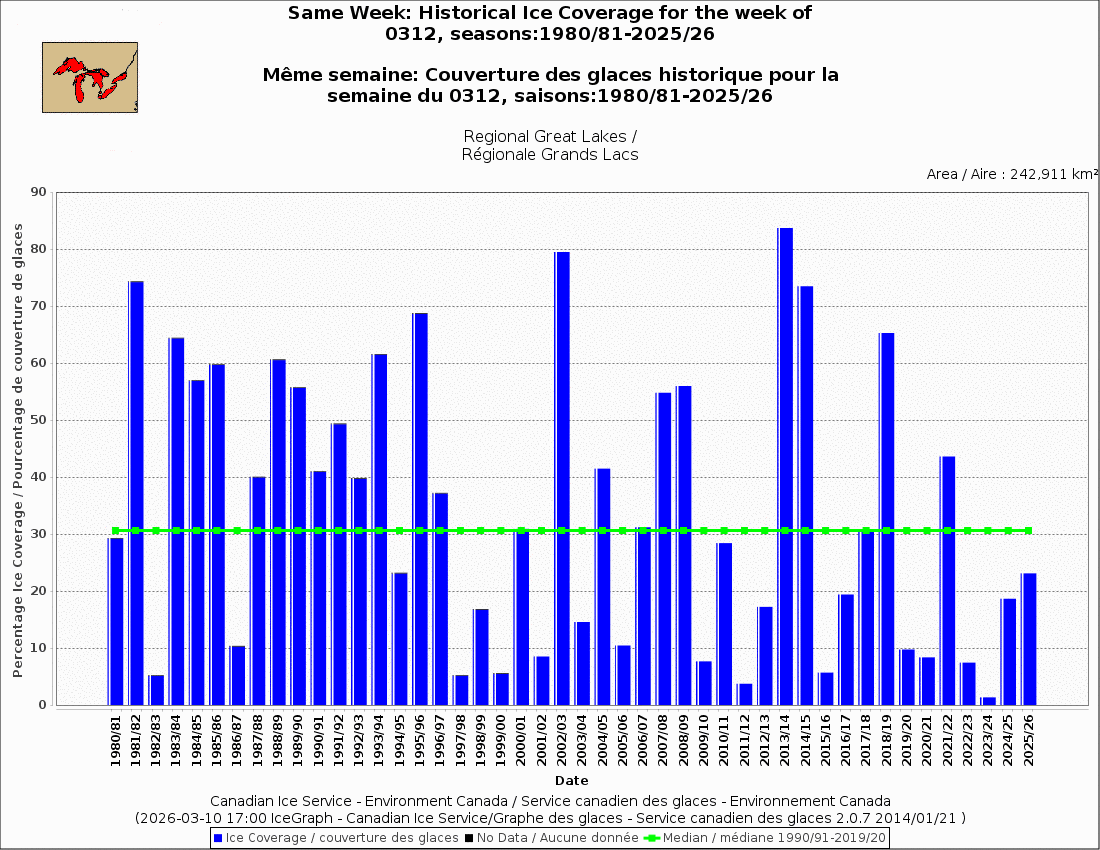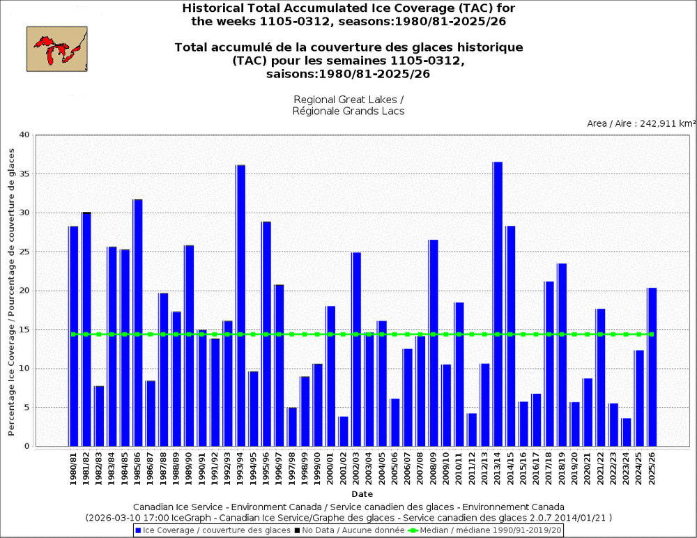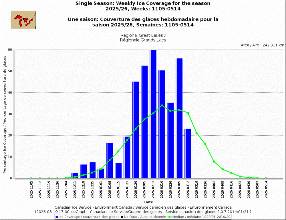 Weekly ice for March 9. Been a decent ice season. This is only the 2nd week that ice was below avg, and that being driven by much lower ice on L Superior.