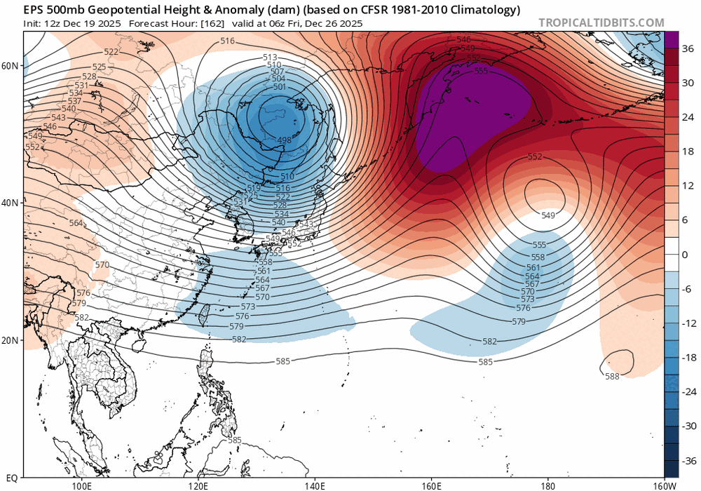 I dunno,but the (EAWM,East Asian Winter Monsoon should be coming up which could possibly shift the HP into Siberia,with troughs extending into East Asia into the Pac,im just gonna use the EPS I.E,this could seemingly change the pattern as we get into the New Year,for how long,really have no clue -