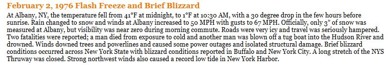 I found the below on the NWS Albany page. This also got me reading again about the Buffalo Blizzard in 1977 when they did record 12" but the bulk of the snow was blown into Buffalo from a frozen Lake Erie. https://www.weather.gov/aly/majorwinterstorms