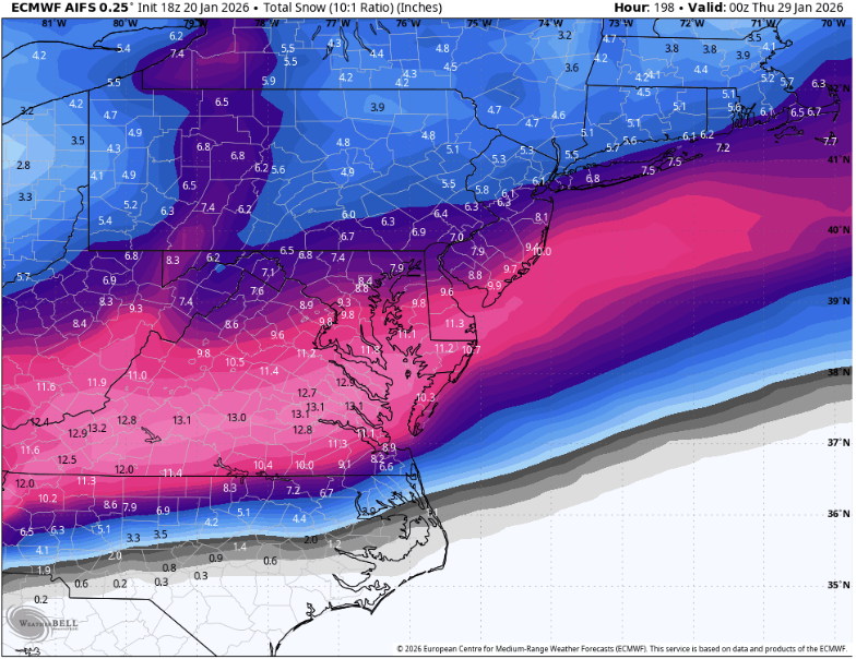 18. Nobody knows what the exact totals will be. The max is a lot of snow and the minimum is an ice storm. Weather channel uses the NBM along with their own recipe for the apps. It’s not to be trusted. We need it to trend a tick or two further south. Right now we’re in a flux between Short range and Long range models. Tomorrow night we will have the best idea on what will occur. IMO. .