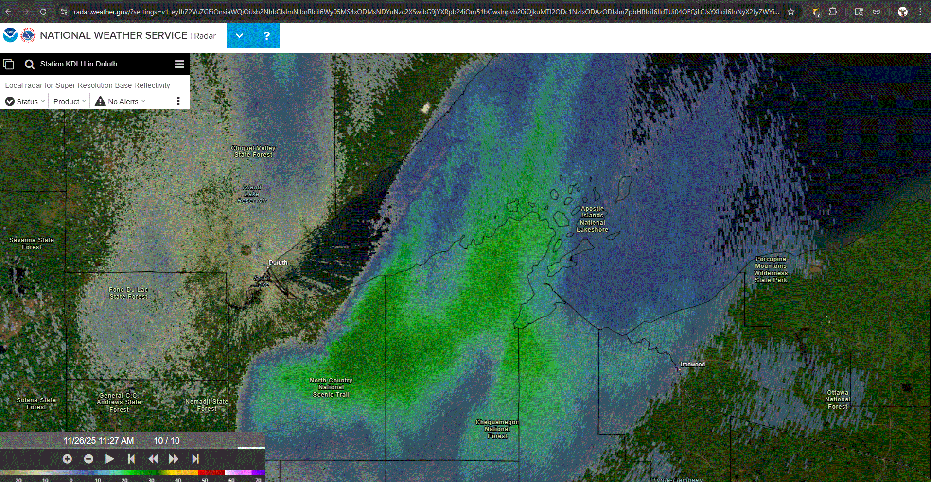 Winds into the upper 30's this morning. Snow been blowing around pretty good. N WI over into the UP getting hit hard. They already had around a foot early this morning. Radar not picking up W UP, but it would look the same.