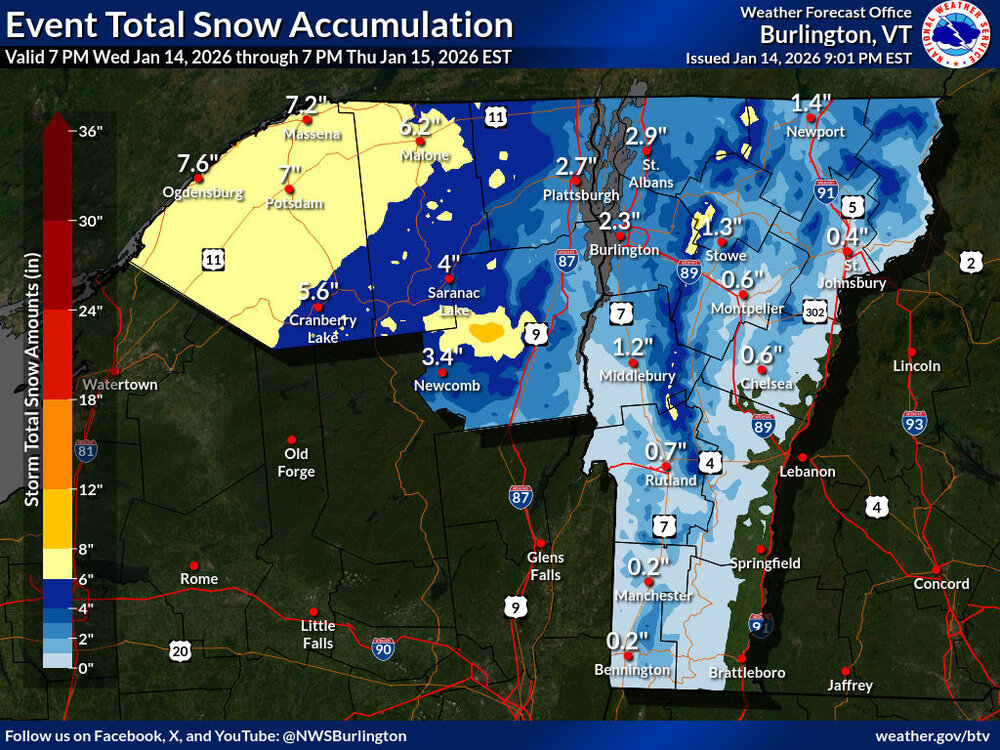 Thanks for that update – as noted in the BTV NWS forecast discussion below, it looks like it’s snow right from the start of this system at 3,000’ and above. I’m sure the 2,000’ – 3,000’ elevation band should do fine as well though based on the way the snow levels were already down to 2,300’ as of this afternoon. There hasn’t been much of a change with respect to expected accumulations in the valleys, but the BTV NWS point forecasts have given a bit of a bump in accumulations for the mountains (~6-12” in the Mansfield point forecast), and I see that there are a few shots of that 8-12” shading making its way into the Event Total Snowfall Accumulation Map now. Area Forecast Discussion National Weather Service Burlington VT 653 PM EST Wed Jan 14 2026 Lets start with what we know, its currently 26F at Whiteface, 28F Mt Mansfield, 30F at Little Whiteface, SLK 39F and 45F here at BTV, indicating elevations above 3000 feet should see an all snow event, producing a sharp elevation dependent snowfall from valley floors to summits, especially in VT. …a sharp elevation dependent snowfall is expected with a dusting to 3 inches Champlain Valley 8 to 10 inches atop Mt Mansfield to Jay Peak and similar amounts over the northern Dacks.