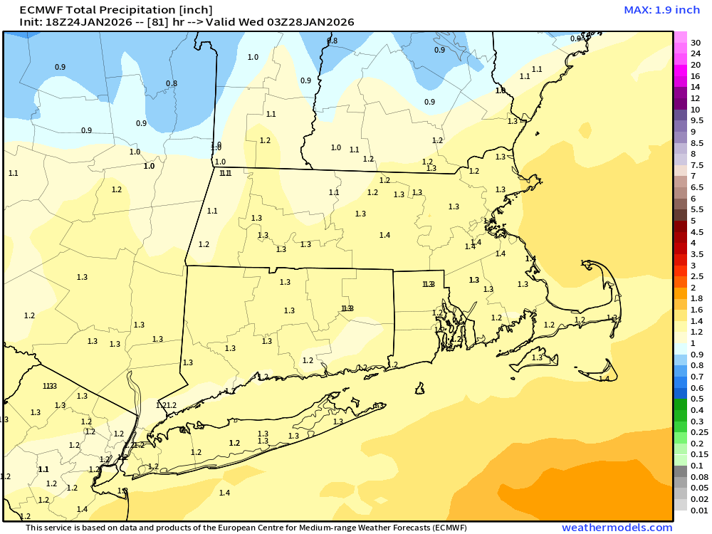 Just for giggles and the people I share weather info with on a Rutgers sports board, I put together the data set below for New Brunswick, as most posters there are alums and/or live reasonably close by, so NB can be a decent surrogate for much of CNJ and for 95 from Trenton to NYC. Anyway it's total QPF, snow QPF from the 10:1 maps and ZR QPF and sleet QPF, from subtracting the snow/ZR from the QPF (and sleet depth at 3:1). I'll be curious to see which model at 0Z tonight did best, since I'm just 5 miles NE of NB. Thinking my 10.4" snow/sleet prediction is decent (NWS was 11.9" last night when I made my guesstimate and is now 10.1") and I still think (have for a couple of days) 8-12" for CNJ/EPA between 78 and 276/195, as well as the 95 corridor from Philly to NYC is a good call. Have a great storm all. I might paste all the snowfall maps too if I get motivated more. HRRR: 1.5" QPF - 11.6" of snow (1.16" QPF) - 0.12" ZR = 0.22" QPF as sleet or 0.66" sleet (assumes 3:1 ratio) NAM: 1.4" QPF - 5.6" of snow (0.56" QPF) - 0.02" ZR = 0.82" QPF as sleet or 2.46" sleet (assumes 3:1 ratio) ICON: 1.5" QPF - 6.3" of snow (0.63" QPF) - 0.00" ZR = 0.87" QPF as sleet or 2.61" sleet (assumes 3:1 ratio) RRFSA (new NAM): 1.3" QPF - 12.4" of snow (1.24" QPF) - 0.06" ZR = 0.0" QPF as sleet or 0.0" sleet (assumes 3:1 ratio) GDPS (CMC): 1.8" QPF - 9.5" of snow (0.95" QPF) - 0.0" ZR = 0.85" QPF as sleet or 2.55" sleet (assumes 3:1 ratio) UK: 1.1" QPF - 10.2" of snow (1.02" QPF) - 0.0" ZR = 0.08" QPF as sleet or 0.24" sleet (assumes 3:1 ratio) Euro-AIFS: 1.3" QPF - 12.2" of snow (1.22" QPF) - 0.0" ZR = 0.08" QPF as sleet or 0.24" sleet (assumes 3:1 ratio) Euro: 1.2" QPF - 7.2" of snow (0.72" QPF) - 0.1" ZR (this was a guess as the Pivotal algo is suspect) = 0.38" QPF as sleet or 1.14" sleet (assumes 3:1 ratio) -