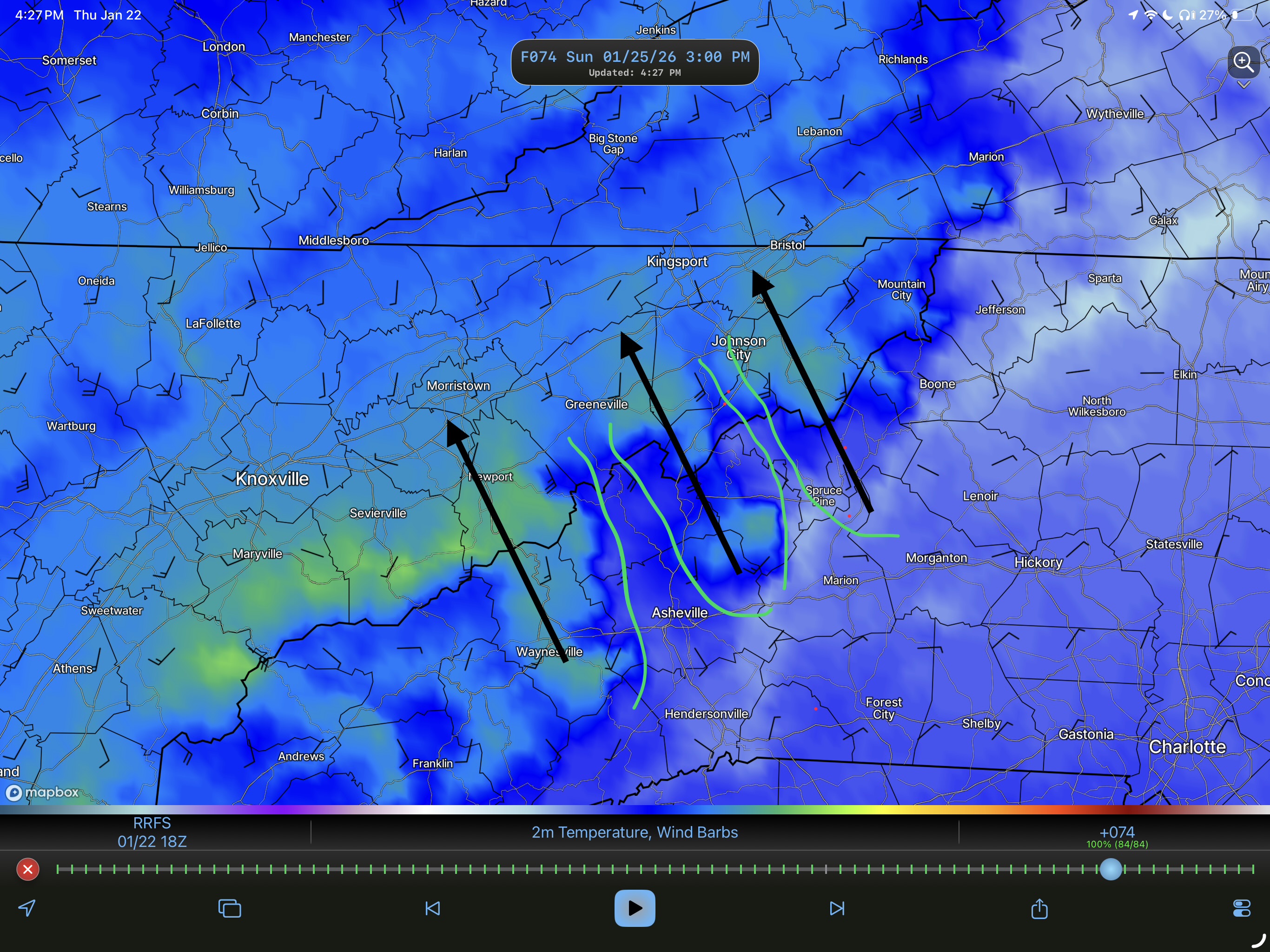 I honestly don't know where the other "streamer" is coming from". It may well be catching the Indian Creek drainage from near Sams Gap. You really want to look at the mountain on the NC side. It has to sit perpendicular to the SE winds. Could be Unaka. As much downslope as Johson City gets(and I am on the terminus of that I26 streamers). But yeah, that almost has to be Roan Mountain causing that other warming area - sits perfectly upstream for that warming to happen. That Roan Mtn warming comes right around the end of Buffalo(could be using Buffalo as well). And honestly, JC could be catching the Indian Creek funnel which connects to the Roan stream. Crazy physics in the mountains. Just another great example of why it is so difficult to forecast here. And the win can howl on Roan Mountain.