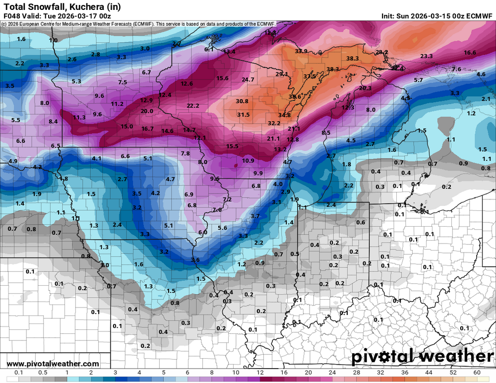 Places like Iron Mt Michigan with 3.75 to 4 qpf all snow winds to 60mph .4ft within the windows of potential. Pretty epic