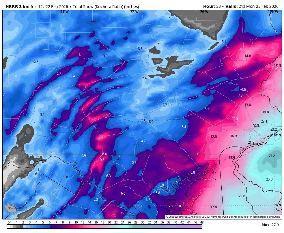 Latest HRRR was…not great. Lots of rain/snow mix today and then the coastal western edge was limited to far eastern PA counties and eastward . -