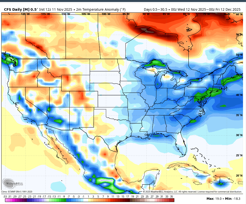 If the below climate forecast model is to be believed....our area in the Northeast across the Northern Mid Atlantic would see some of the coldest temperatures relative to average over the next month through December 11th -