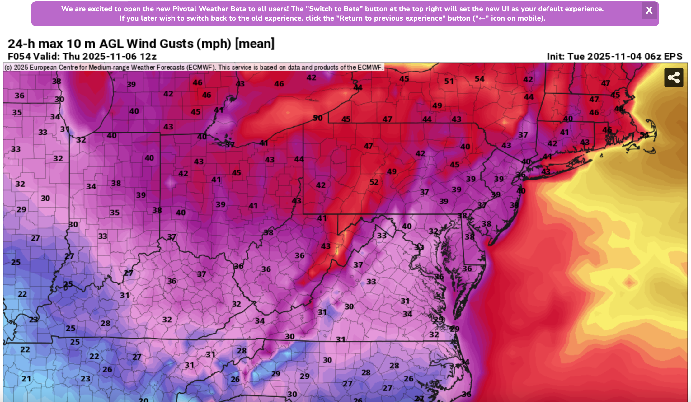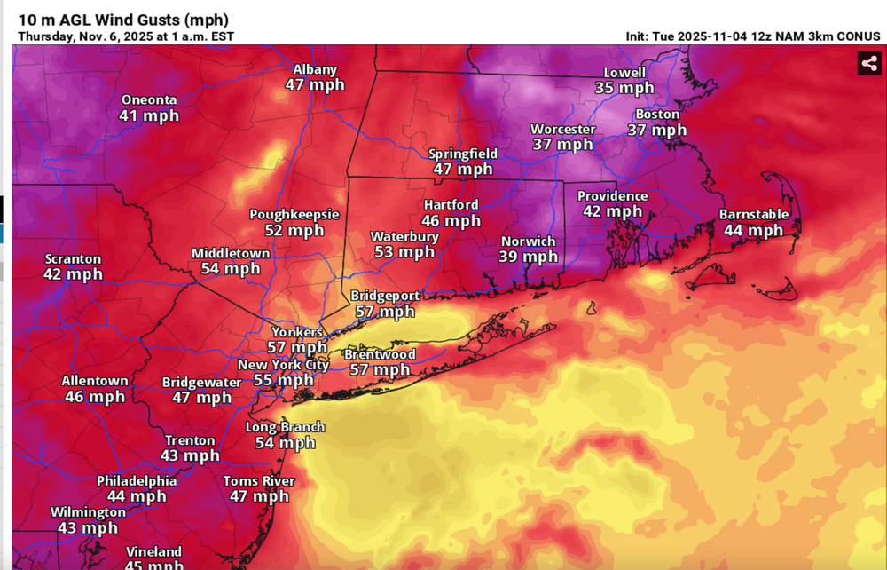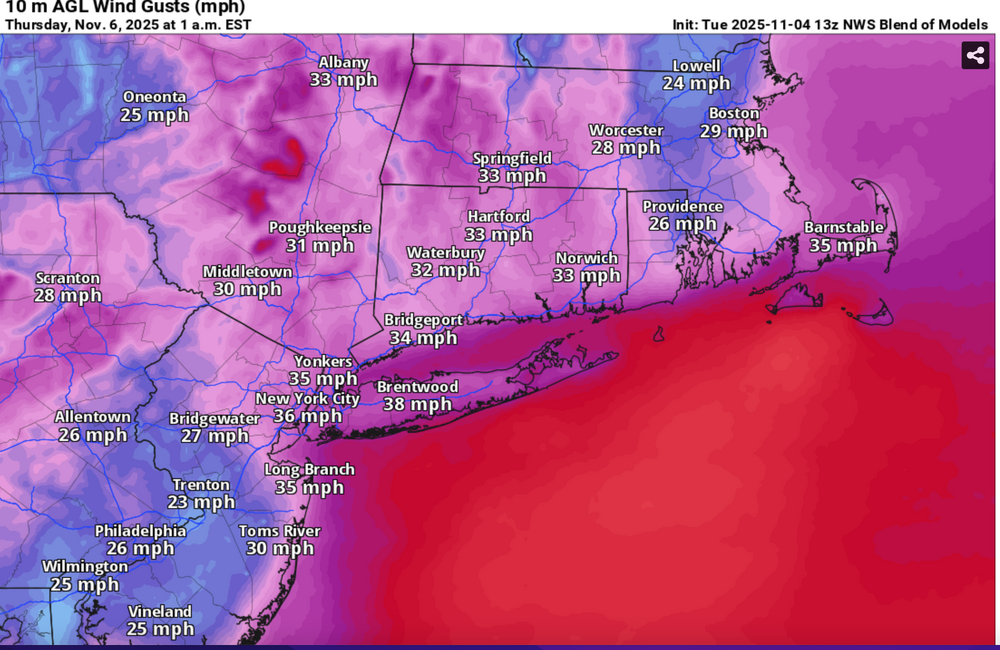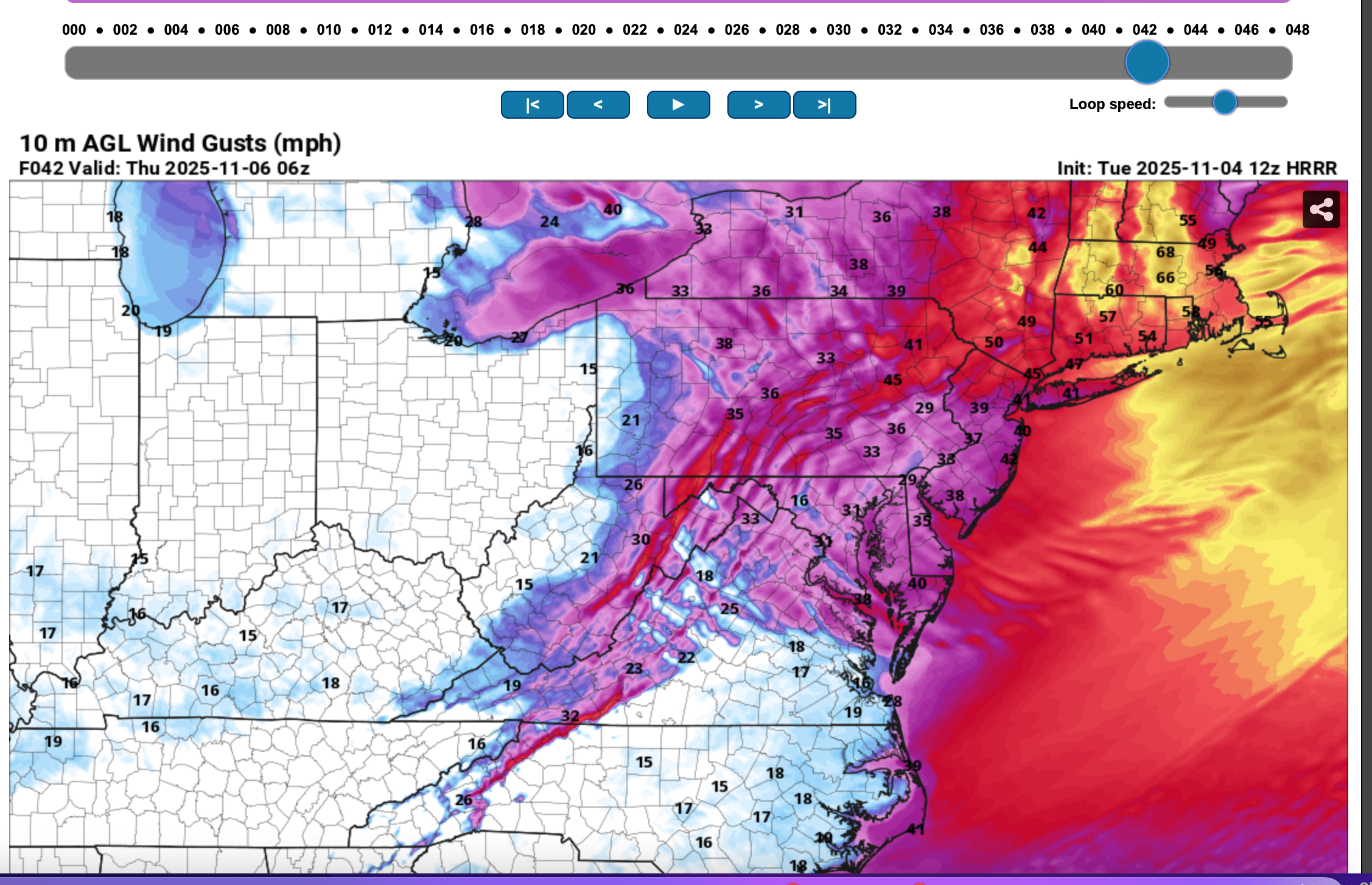 Please follow whatever NWS OKX PHI ALY and BOX issues on the coming Wednesday night wind and tides. From our subforum standpoint have tagged wind damage for Wednesday night's brief but significant wind event associated with a 55-65KT 850 MB Cold Air Advection jet overhead. No guarantees, so the worst case 12z/4 HRRR and NAM suite max wind gusts should be 5 MPH too high but nevertheless, we should see more power outages than this morning (attached), and I expect at least a few night time -Thursday morning detours travel delays due to downed tree branches especially ridges and through NYS-CT. This will impact air travel for arrival departures Wednesday evening possibly into Thursday morning. Lapse rates look unstable for a few hours Wednesday evening up to at least 900MB, with strong subsidence drying in the wake of the Wednesday evening cold frontal passage adding to momentum transfer. A 12 hour 500MB HFC of over 150M amplifies in its east-southeast trek across NYS into New England Wednesday evening, briefly increasing the nw 850MB jet behind it to 65 kt or a bit higher. PA/NJ look to be on the southern fringe of the greatest impact which should be NYS and New England. It's an early call so no guarantees but I think its worth an eventual wind Watch or Advisory. I expect at least half the airports in the NYC metro area to hit at least 40 kt, possibly reaching 50 KT? Wind gust potential diminishes rapidly in our NYC subforum area by dawn Thursday. BLOWOUT Tide Thursday morning?: There is a chance that parts of the east facing coasts at just after midnight Thursday morning's LOW tide cycle will see a blow out tide less than -1.6' MLLW because of this brief period of wnw wind. Added HRRR max gusts at 10P/5 and 1A/6, the 12z/4 FOUS with my own personal trigger of 27KT BL wind as a threshold of wind event concerns, the 844AM today power outages with the relatively light sub 40KT gusts. Then I added the 3K NAM sampler max wind gusts, the more conservative Blend Of Models wind gust forecast and the the EPS marginal advisory wind gust modeled prediction. 1058A/4