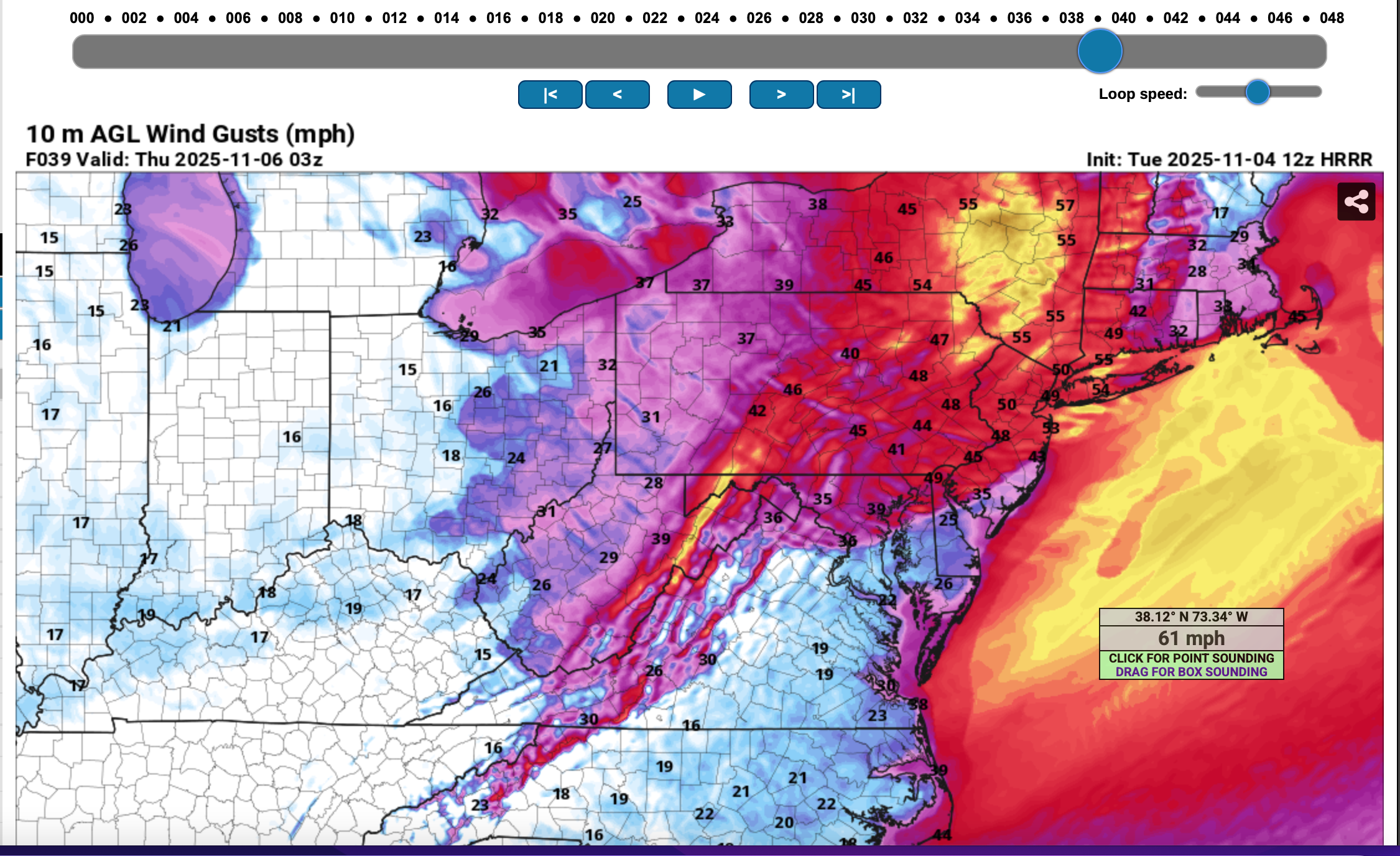 Good thing peak winds at 900-925 occur when its dark, if this came through 12-18 hours later I think some gusts over 50 would be possible.