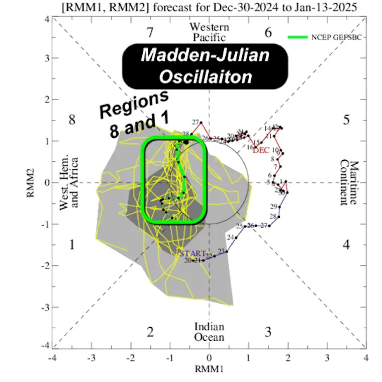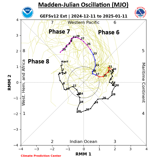 The GEFS last December was hinting at a big push into 7. But the MJO slowed in the warmer 5-6 phases mid to late December with the +EPO warm up. We did briefly get a MJO 8 last January but it was more pronounced in 1-3. Then the MJO missed phase 8 last February when we had the first 5 sigma Greenland block link up with the Southeast ridge.