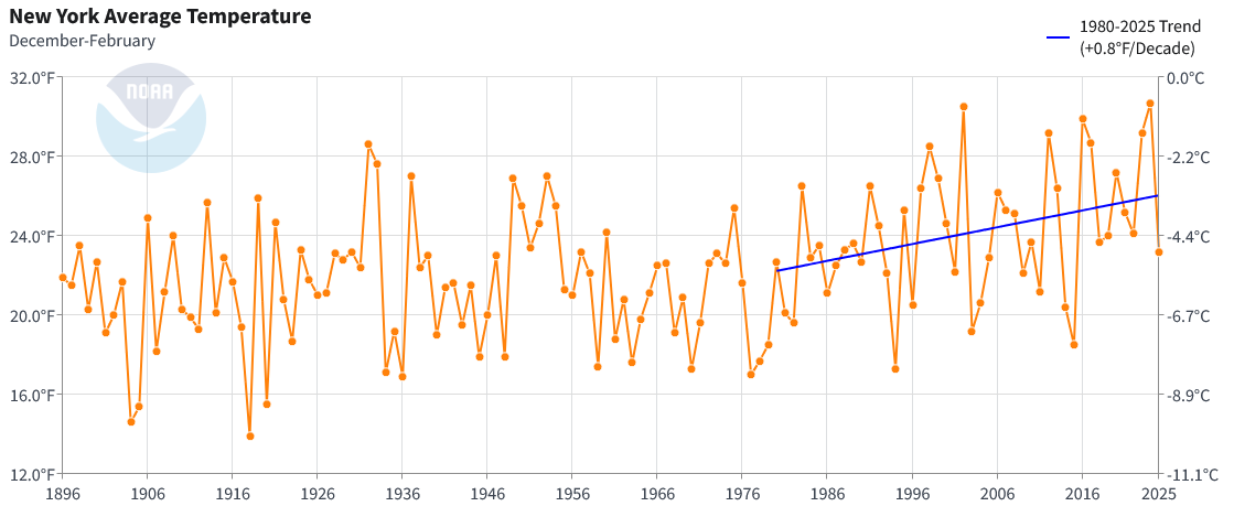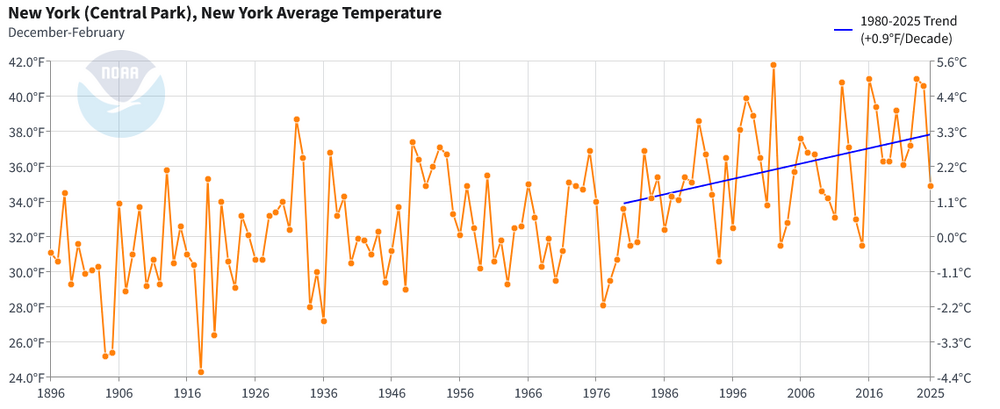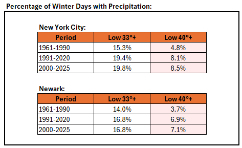 For some comparative statistics, New York City has been warming only slightly faster than New York State overall (0.9° per decade vs. 0.8° per decade) since 1980. That suggests that the overall share of the recent warming is due to broader changes in climate rather than the City's heat island effect. In any case, the frequency of above freezing low temperatures and above 40° low temperatures during winter precipitation events has been increasing. This applies to New York City and other nearby areas e.g., Newark. This could result in an increased frequency where light precipitation events could wind up having more rain than snow relative to earlier in the climate period. However, any structural decline in seasonal snowfall from an overall warming of winters probably won't be evident until the mid-2030s due to stochastic variability. Moreover, there will continue to be some big snowstorms (even if the recent big snowfall drought skews perceptions) and snowy winters. Winters can still feature cold. December 2025 is an example, as it's on course to be the coldest December in 15 years in NYC.