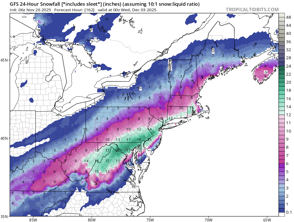 Fun to track, but hard to tie any excitement locally. No real science applied to the “pessimism”, just erring on side of climo and the many fail modes favored at my specific location. On the other hand, lucked out on a record event earlier in the month. So perhaps the wins can continue. I’d be happy to just see some more snow. But as a junkie for #’s, I’m looking at the thresholds of 2”+ & 5”+. The former is just cool and gets to double digit Nov snowfall. From what I can uncover, we’ve already surpassed any reasonable verifiable record for month. The latter would mean surpassing the individual seasonal totals of ‘23/‘24 & ‘24/‘25 by end of November. Which is both silly and awesome at the same time. -