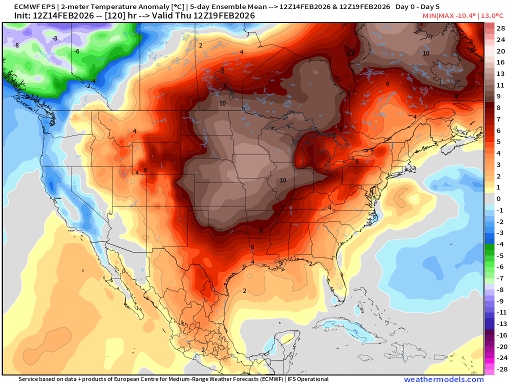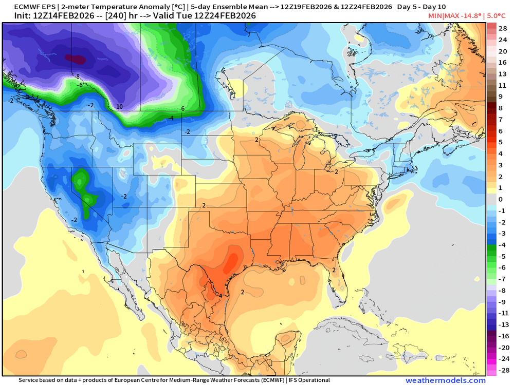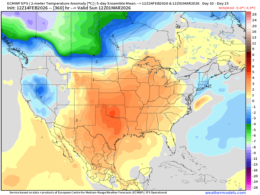 Looks like after this week the weather may turn to winter again. Most of the Euro products show this. Here is the AI. Wouldn't mind one more period before spring. Obviously we are starting to enter the time of the year where sun angle makes a difference but its still only February. -