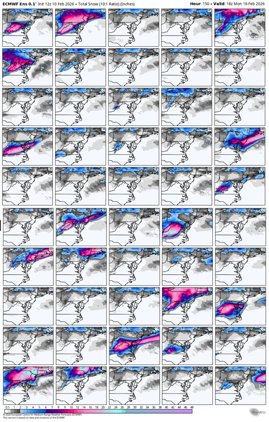 There are only a handful of ensemble members showing snow in south central Virginia. It's those few outliers showing significant amounts of snow that are skewing the snowfall mean.