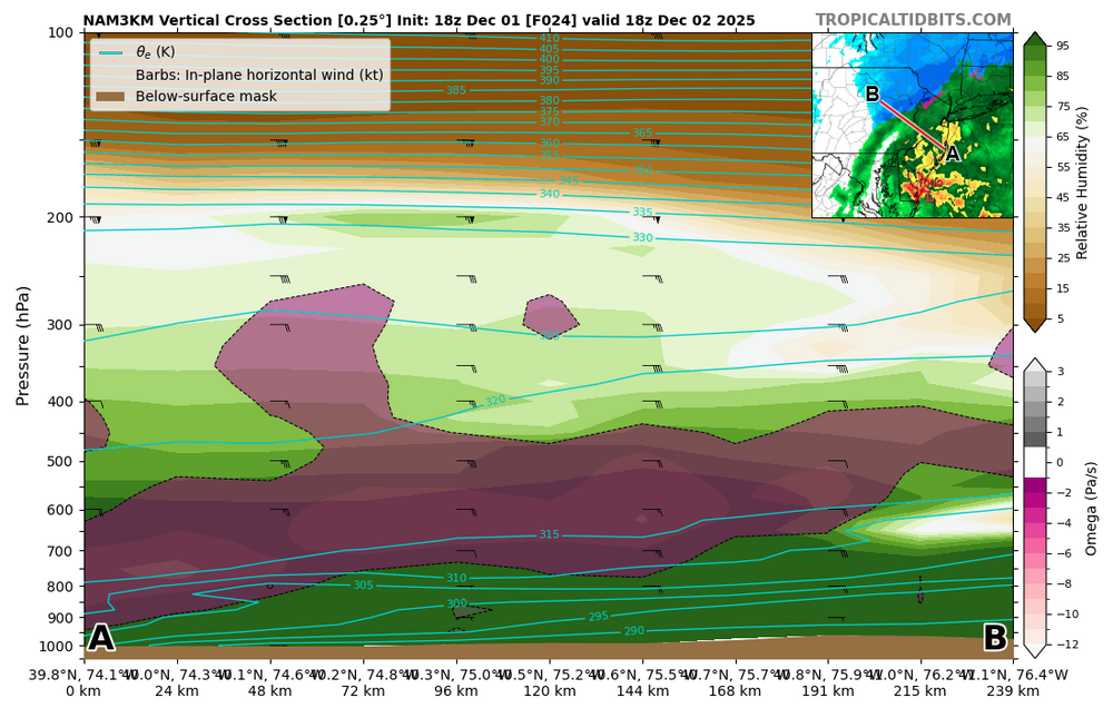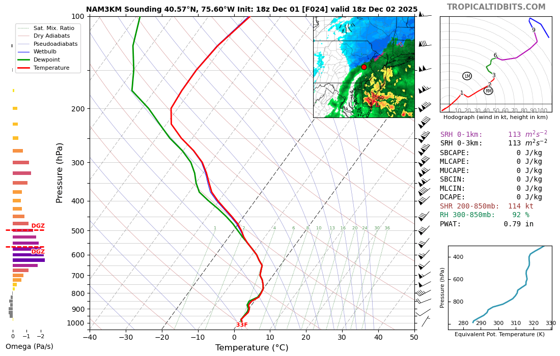 3k actually never gets KABE above freezing at 850s (though it's close), but does sneak to 33 at 925 down to the surface. At 1-2pm tomorrow, the 3k shows rain BUT some deep lift just below the DGZ and even stretching into the DGZ. The DGZ is pretty high up in the atmosphere, but as you can see in the skew-T the sounding is marginally above freezing. If you can get some deep lift and rates to increase within a backside band as the storm departs, you could potentially finish with some heavy snow and fat dendrites if the column cools isothermally back to freezing. Of course, all of this could be for nothing and if 1.) The mesos are correctly handling temperatures and 2.) The rates aren't heavy enough to cool the column then we'll definitely see the lower end of snow totals materialize. Just wanted to point out a way that you could potentially see higher end (3-4" totals) materialize along the I-78 corridor which is currently the 90 percentile from the NWS. -