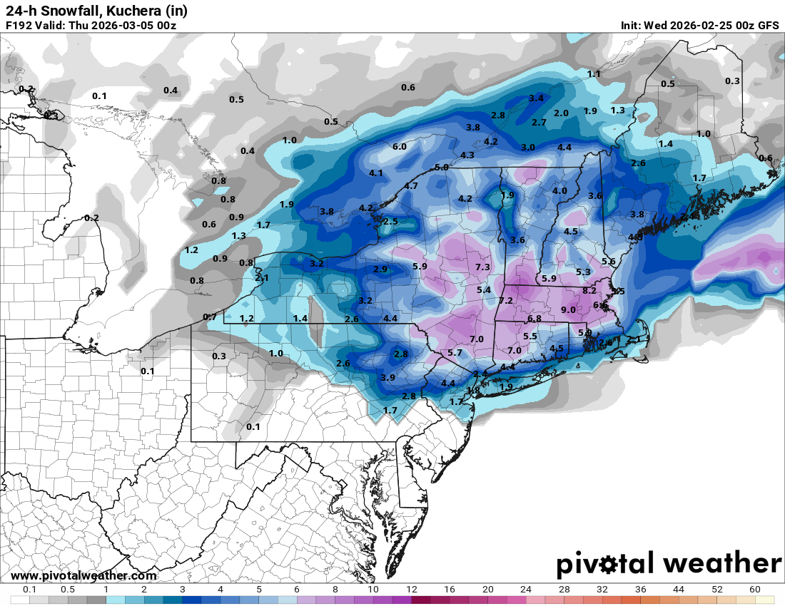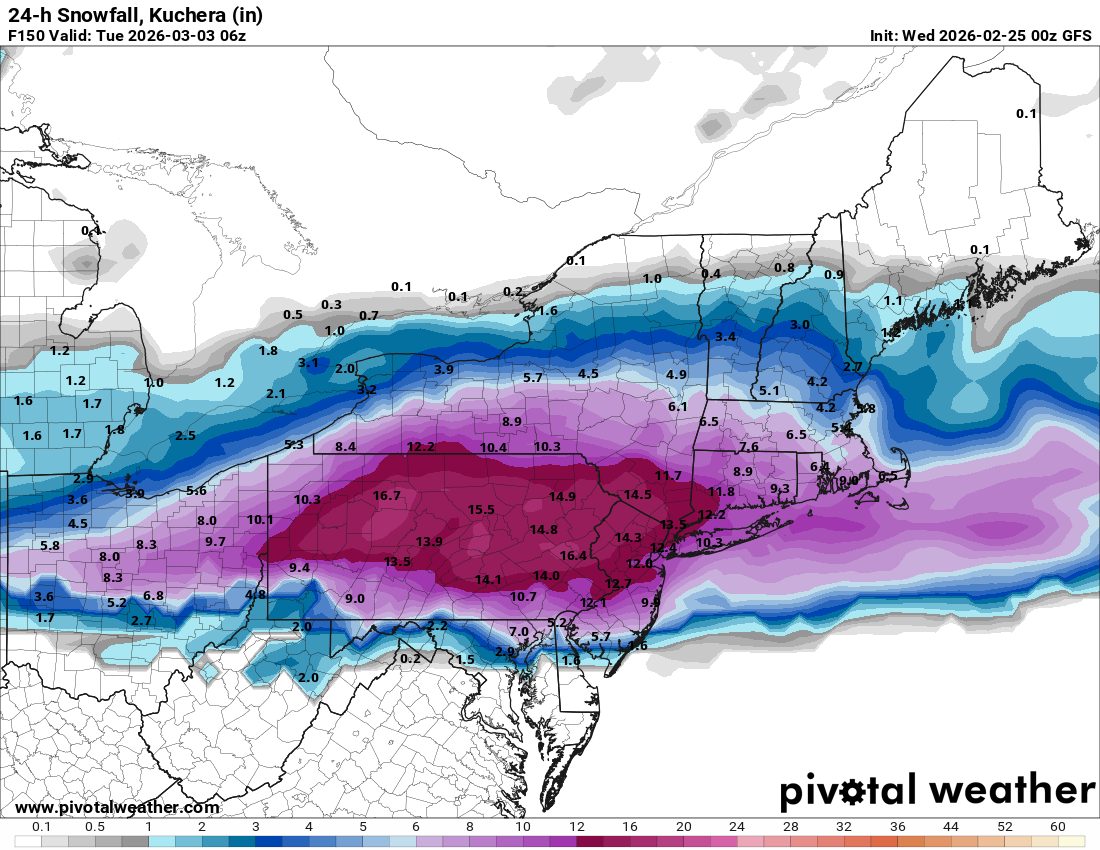 Central and northern PA at 2'+. Wonder if the Gfs is treating them like it treated us with its early runs for this past weekend. Love to see that come 100 miles south. -