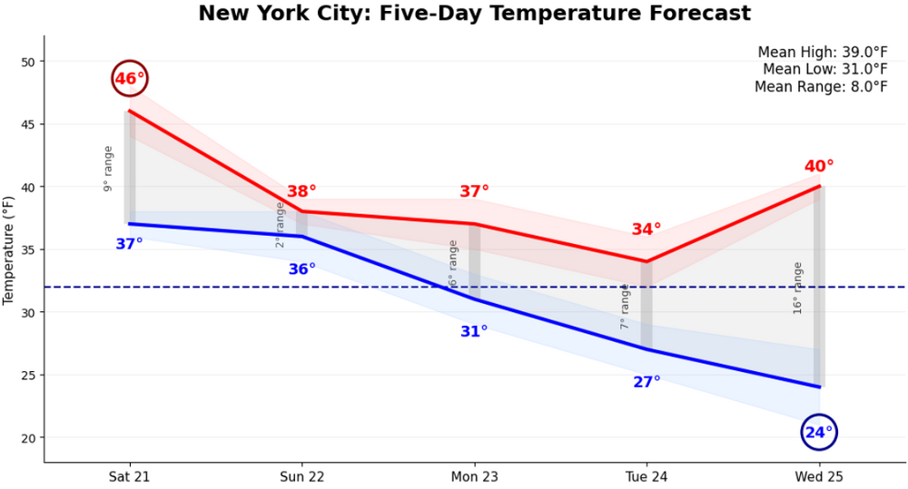 Although the 15z NBM shows highs of 38° on Sunday and 37° on Monday, I suspect that the temperature will be near or just below freezing during the height of the storm. The 38° high on Sunday will occur before the onset of the storm. The 37° high on Monday will likely occur late in the day after the snow has moved away. Based on the standard deviation band, a reading in the upper 20s cannot be ruled out. We'll have to see where things are in the soundings for ratios, but this doesn't look like a low snow-liquid ratio event.