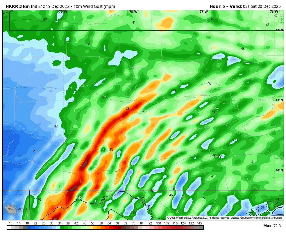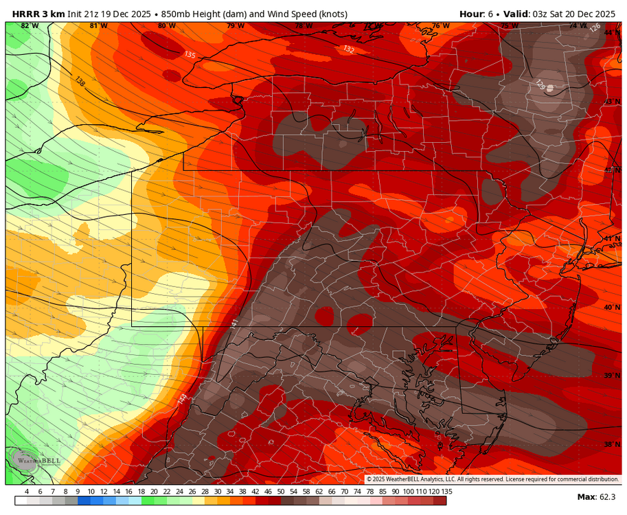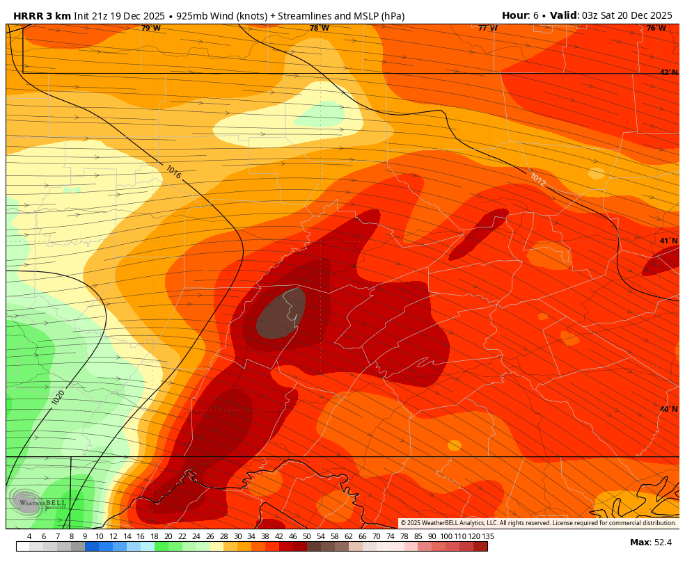 Somewhere in the ballpark of an inch of wind blown snow. There’s also been several snow squall warnings around as well with one currently stretching across I-99 from just north of Bellwood to Tyrone and extending over towards Lewistown The high wind warning worthy gusts in the actual warned counties may occur during the next several hours as near term guidance showing an enhancement of winds on and just east of the Allegheny Front centering on roughly the 7pm-midnight timeframe. Some HRRR images for 10pm Surface wind gusts (mph) 925mb winds (knots) 850mb winds (knots) -