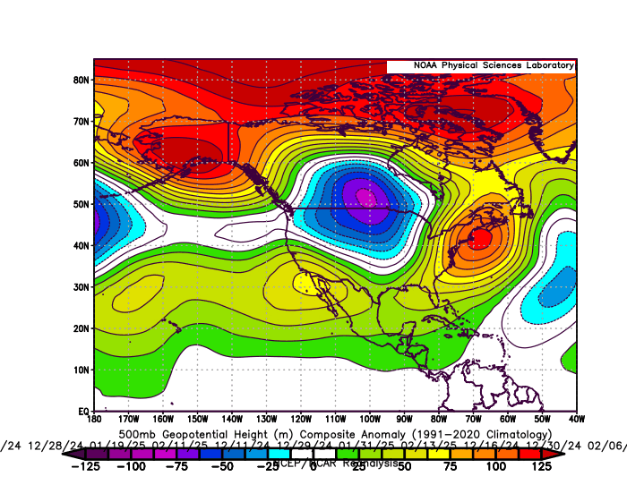 This is the actual 500mb pattern last winter on the 11 days which .20 or more of precipitation fell from Philly to Boston. Very fast extended Pacific Jet along with a Southeast ridge linking up with the Greenland block. So the NYC average temperature last winter during the days with the heavier precipitation was 41° which was too warm to reach anywhere near average seasonal snowfall. Long range models consistently missed this pattern beyond 1 week out. Has nothing to due with luck or Monday morning quarterbacking. The storm track is a function of the pattern. I still think it’s possible to change things up a bit. But I am not going to make that forecast based on a week 2 or 3 model forecast. it has to show up in the short term in order to be believable. 11 day 500 mb composite DJF 24-25 when .20 of precipitation fell from Philly to Boston