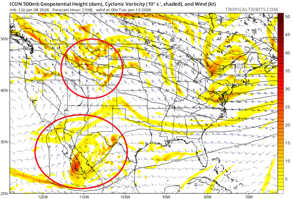 The ICON would be a nice snowstorm for most of our area if it played out that way. But the 12z ICON is significantly different than the 6z GFS and 0z ECM plus almost all individual ensemble members. By 0z Tue, the initial shortwave energy to eventually carve out the longwave trof in the MS valley is in WYOMING on the ICON. But it is noticeably further east through the DAKOTAS on the GFS and ECM. Related to this feature is the phasing of the upper level low in the Southwest US. The further west positioning of the northern stream shortwave on the ICON allows most of the southern stream energy to phase into the developing longwave trof, which sets the stage for a much better trof orientation and 500mb height field. I think the ICON is wrong with this feature, but I'll be watching subsequent runs closely.