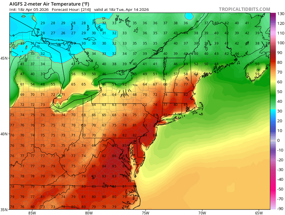 Cooler conditions have returned to the region. Temperatures will likely top out in the 50s through Thursday. Highs on Tuesday and Wednesday will likely struggle to reach the lower 50s. Wednesday morning could see the low temperature approach 32° in New York City. Should the mercury reach 32°, New York City would see its second consecutive April with a freeze (last year's last freeze was April 9). The last time that happened was 2015 and 2016. Temperatures will return to the 60s on Friday. The warmth will extend into the weekend. The ENSO Region 1+2 anomaly was +1.2°C and the Region 3.4 anomaly was +0.2°C for the week centered around April 1. For the past six weeks, the ENSO Region 1+2 anomaly has averaged +1.25°C and the ENSO Region 3.4 anomaly has averaged 0.00°C. Neutral ENSO conditions will continue through at least mid-spring. The SOI was -7.43 today. The preliminary Arctic Oscillation (AO) was +1.535 today.