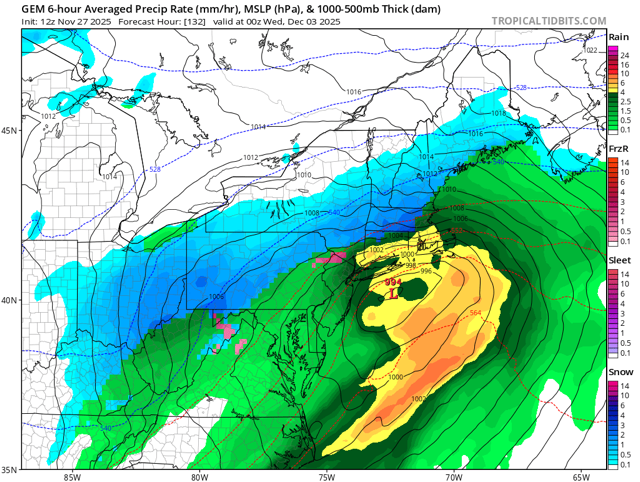 GFS looks nothing like the Euro and is significantly warmer than its own 12Z run. North and west of the city still make out well. Pretty good for the ski resorts.