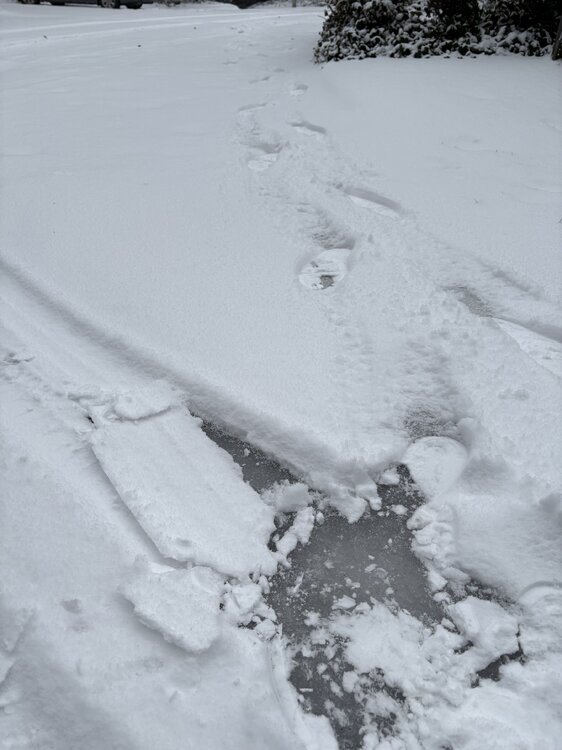 Sheets of ice under the fresh powdery snow near downtown Winston Salem - also.. starting to come down a bit heavier now with bigger flakes! 16 degrees. -