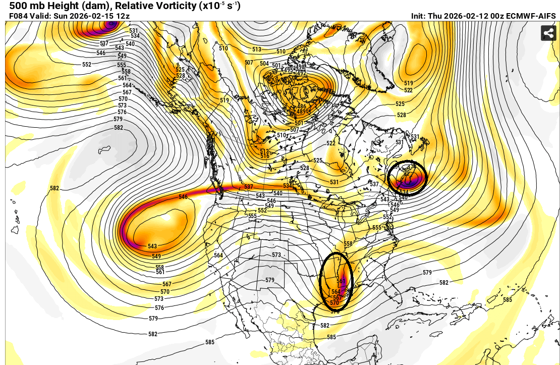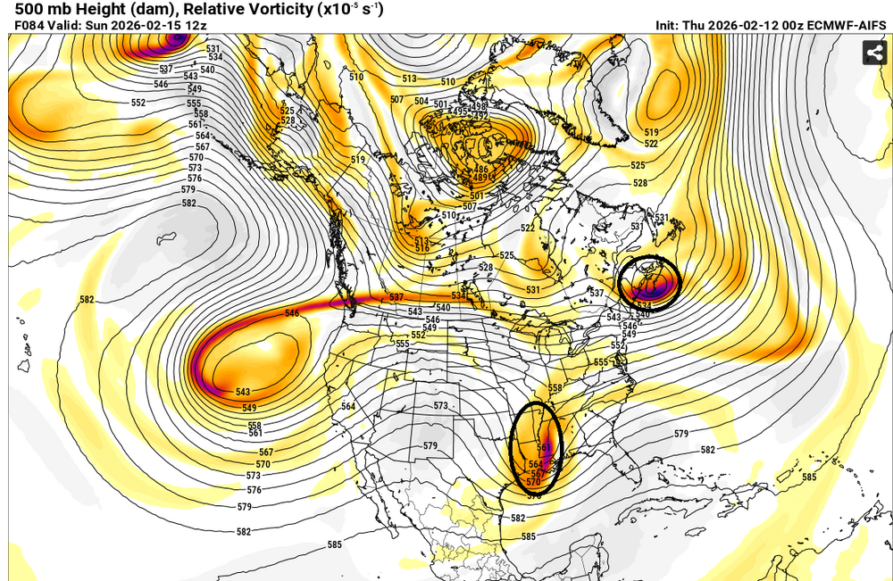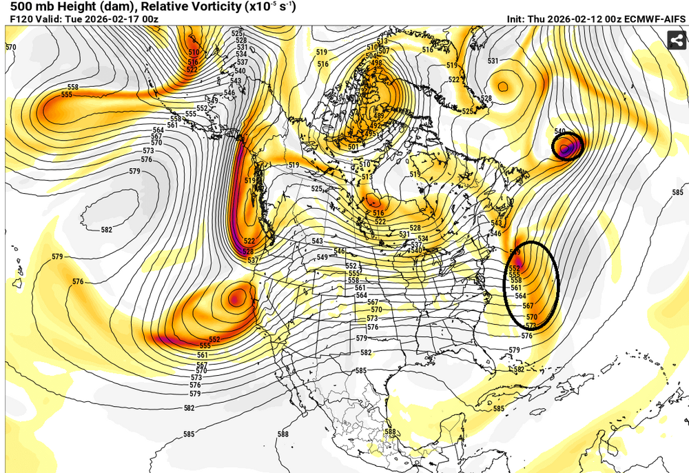 The ECMWF-AIFS is moving into it s high-skill range, where it continues to outperform the non-AI guidance. It continues to show very little prospect for the kind of occasional snowy solution that has popped up from time to time on some of the guidance. At 500 mb, its map tells the story about the low probability of phasing. The northern energy is well in front of the southern energy. This limits the risk of interaction, much less phasing. Not surprisingly, the other guidance now appears to be in line with the AIFS, with none showing a snowy solution for the NYC area. If one looks at the EPS ensembles, 16% showed 6" or more snow and fewer than 6% of members showed 10" or more snow during the 2/12 0z cycle vs. the respective 22% and 12% during the 2/11 0z cycle (in which the operational ECMWF showed a phased solution). Although it's premature to suggest that precipitation, should it arrive, cannot start as a little snow, sleet or mixed precipitation, the idea of a phased solution with significant snowfall appears unlikely. As has been the case much of this winter, should that outcome verify, the ECMWF-AIFS will again have led the way at an impressive lead time. Finally, the ECMWF-AIFS map 36 hours later shows a distinct failure to phase. -