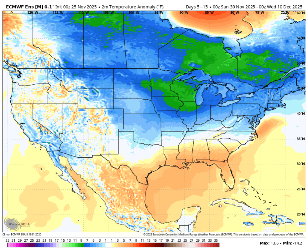 Decent overnight runs with a front swinging through and a weak low forming around Dec 1-2. Room for a NW trend at this range. -