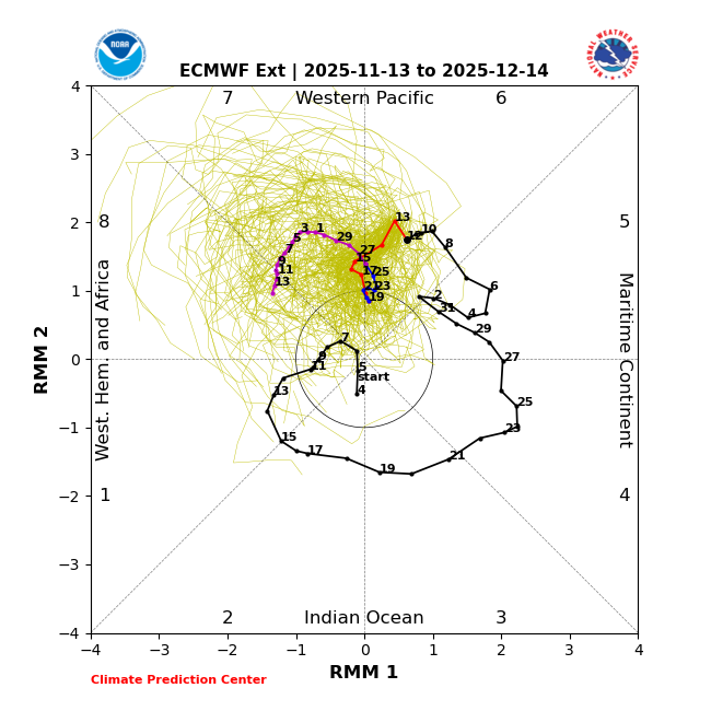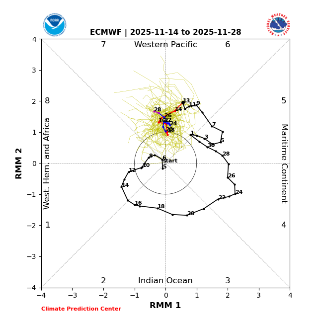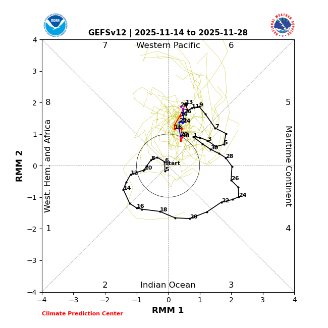 The latest MJO forecast is a mix with GEFS not looking as good but the Euro still looking good: 11/14 GEFS further right with it hung up in middle of 6 rather than 6/7 border: But Euro is still all systems go to 7/8: 11/14 Euro ~same as yesterday with progression into 7: 11/13 extended Euro (they run a day later) continues to look very nice with it again getting to the often cold in the E US phase 8 mid-Dec (can’t ask for better for then):