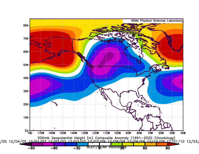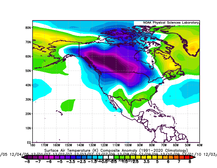 The EPS and long-range ECMWF continue to suggest that an EPO-/WPO-/PNA-/AO- pattern will develop to open December. Such a pattern typically favors a trough's being anchored in the West and extending mainly across Canada. Although some cold could periodically push into the eastern U.S., the coldest anomalies would stay in the west (both in Canada and the U.S.). December 1-10, 1980-2024: Composite 500 mb Anomalies: Composite Temperature Anomalies: December 1-8, 2025 ECMWF Weekly Forecasts: 500 mb Anomalies: Temperature anomalies: -