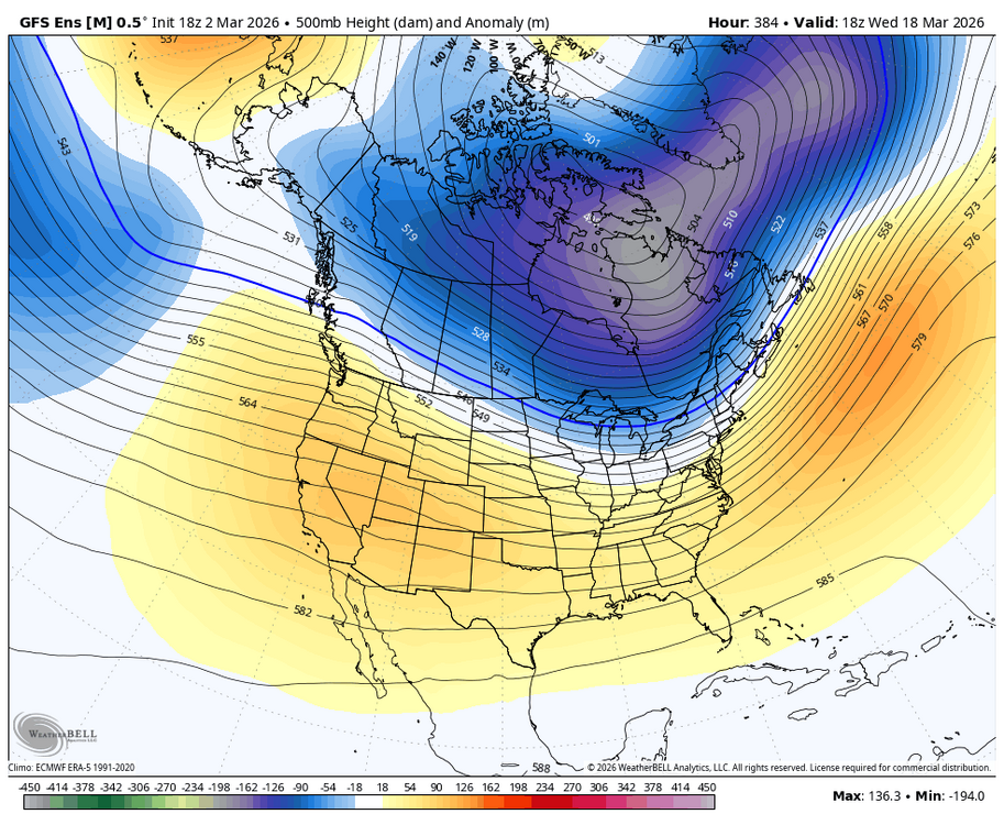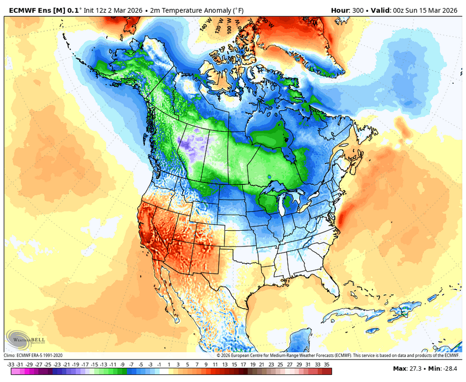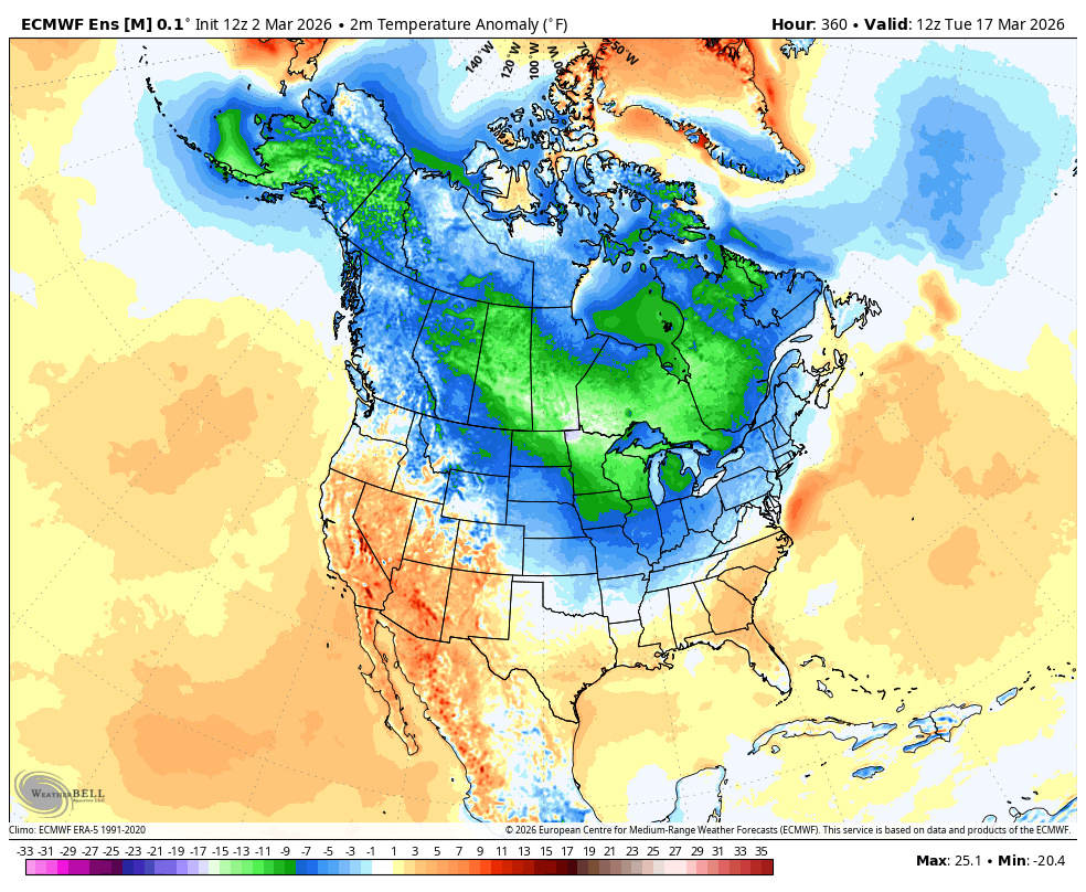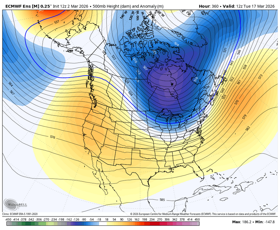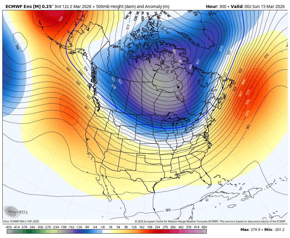 This strong front keeps showing up on the euro Ai and euro to a degree. It’s also on the EPS. Around day 8-9. We saw the euro have that fantasy event. It was also loading up at the very end of the run. It’s a +PNA pattern, but not much blocking showing up so probably would have to time waves perfectly