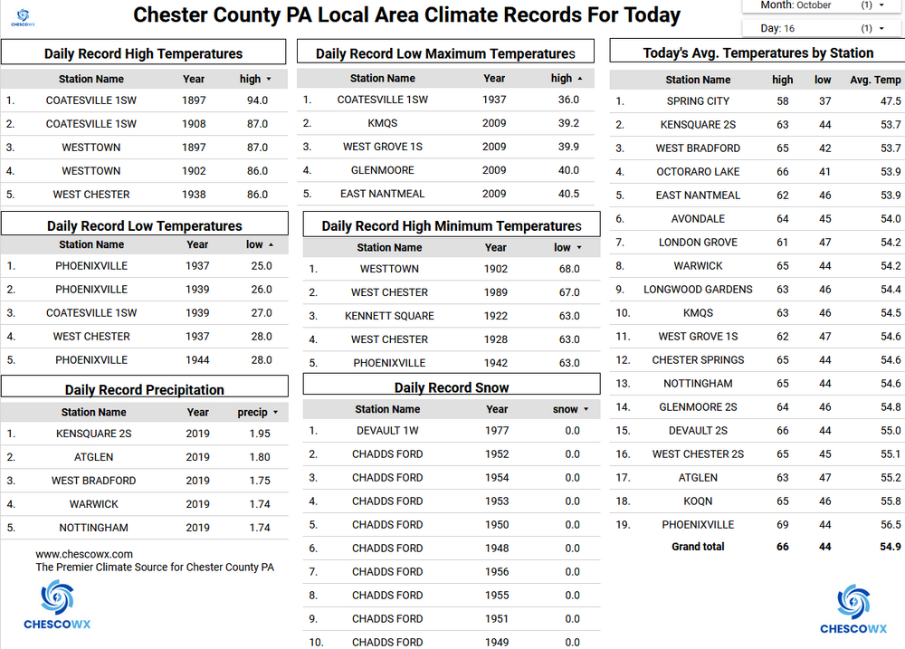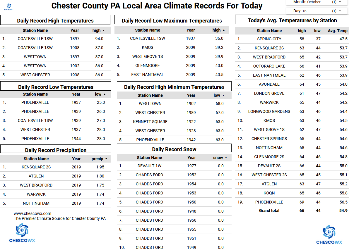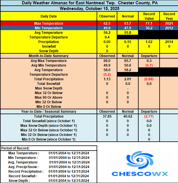 Many of our valley spots across the area saw lows this morning in the 30's with the lowest being our typical coldest spot up in Warwick Township at 33.2 degrees. While some higher spots like West Grove only made it as low as 42.8 degrees. There are a couple of below normal temperature days on the way both today and tomorrow before we moderate to near normal by Saturday and briefly above normal on Sunday before we chill down again to start the new work week. Next rain chances arrive on Sunday night with the next cold front. -