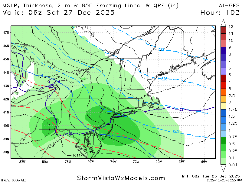 Both GFS and GFS-AI ticked slightly further north vs. 18z. Still snowy (some ice SW) for most areas. Kind of the sweet spot right now.