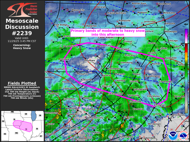 Central Illinois getting clobbered Mesoscale Discussion 2239 NWS Storm Prediction Center Norman OK 1042 AM CST Sat Nov 29 2025 Areas affected...parts of IL...southeast IA...and far northeast MO Concerning...Heavy snow Valid 291642Z - 292145Z SUMMARY...Primary bands of moderate to sporadic heavy snow should pivot from south-central across southeast Iowa, and persist across much of central into northern Illinois through this afternoon. Rates around 1 inch per hour should occasionally occur. DISCUSSION...Long-duration snowfall event will persist through the afternoon, shifting eastward to the northeast of a surface cyclone near the western Kansas City Metro Area. Ongoing heavy snow band across south-central IA should largely pivot across southeast IA and perhaps expand as the strongest mid-level DCVA shifts across eastern IA this afternoon. Farther east, the persistent low-level warm conveyor will maintain a broad swath of moderate snow across central to northern IL. While the bulk of the ascent should remain beneath the dendritic growth zone centered around 550 mb, strengthening mid-level DCVA should foster sporadic bursts of heavier snow. Snowfall rates within these regimes should occasionally reach 1 in/hr. -
