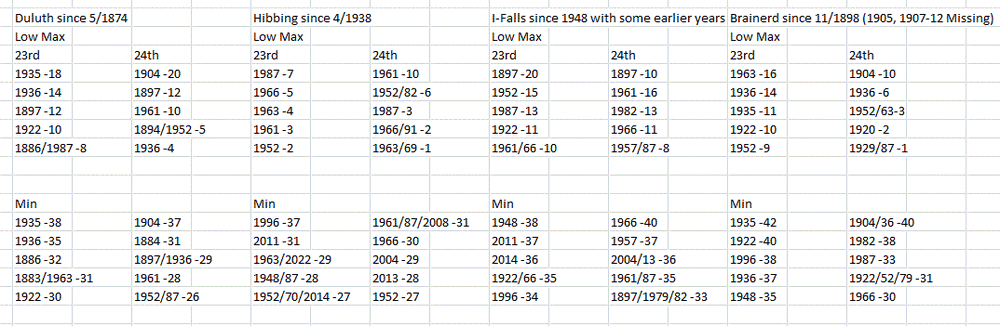 I compiled records for my area for the 23rd-24th. I'd say, as of tonight's model potential, that low max records have a good chance of falling. Friday am lows may reach top 5, but there may be a light wind keeping temps up a little with mixing. But with HP centered over the W Lakes Sat am, radiational cooling will drop temps under calm conditions pretty fast, especially at sunrise where a 3-5 dF drop could occur. If, perchance, the winds are calm Friday am, too, expect the same.