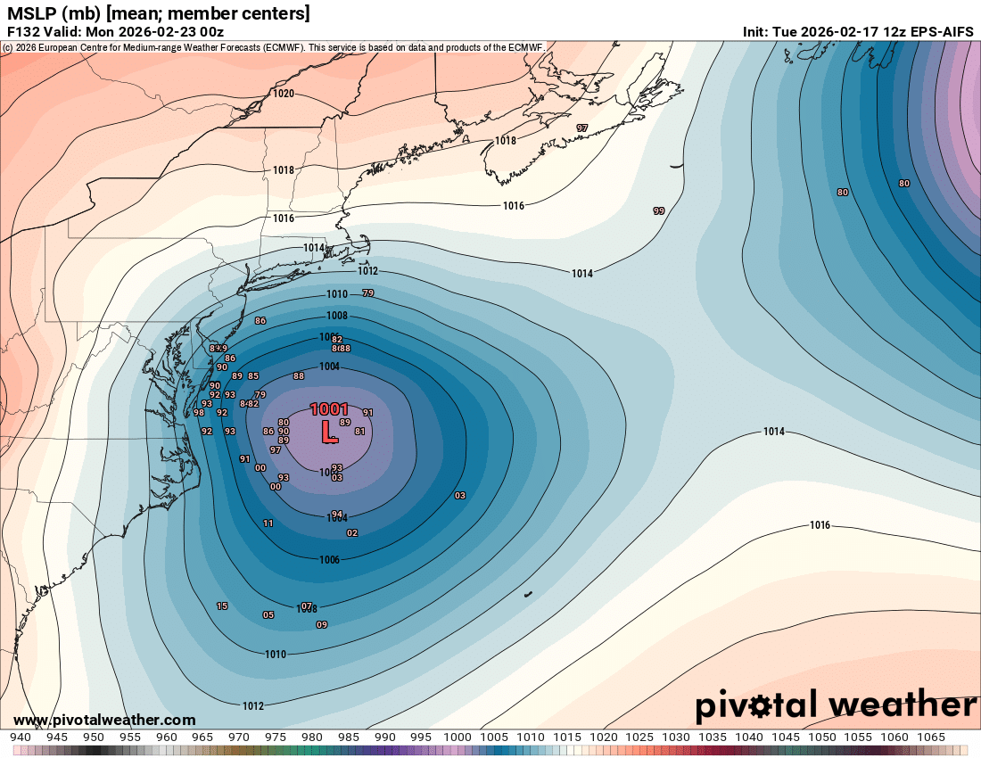 The Euro is not giving up their outlier role without kicking and screaming. At this time yesterday there was no storm at all. At 0z, it put up a weak nothingburger off the NC coast heading E ots. Now it puts a stronger system a bit further north offshore but still heading E ots. Maybe by 0z it will finally find its way. -