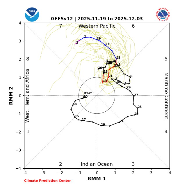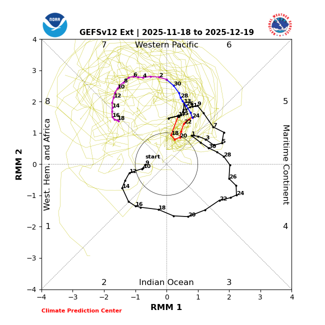 Today’s 2 week GEFS MJO progressed significantly more quickly vs yesterday’s run into phase 7! Today’s 2 week GEFS (11/19) is 2 days faster making it into phase 7 vs yesterday’s run and is already halfway through phase 7 as of 12/3! Yesterday’s 2 week GEFS (11/18): Yesterday’s extended GEFS (11/18) didn’t have it halfway through phase 7 til 12/7 meaning today’s 2 week GEFS gets to halfway through phase 7 four days faster than yesterday!