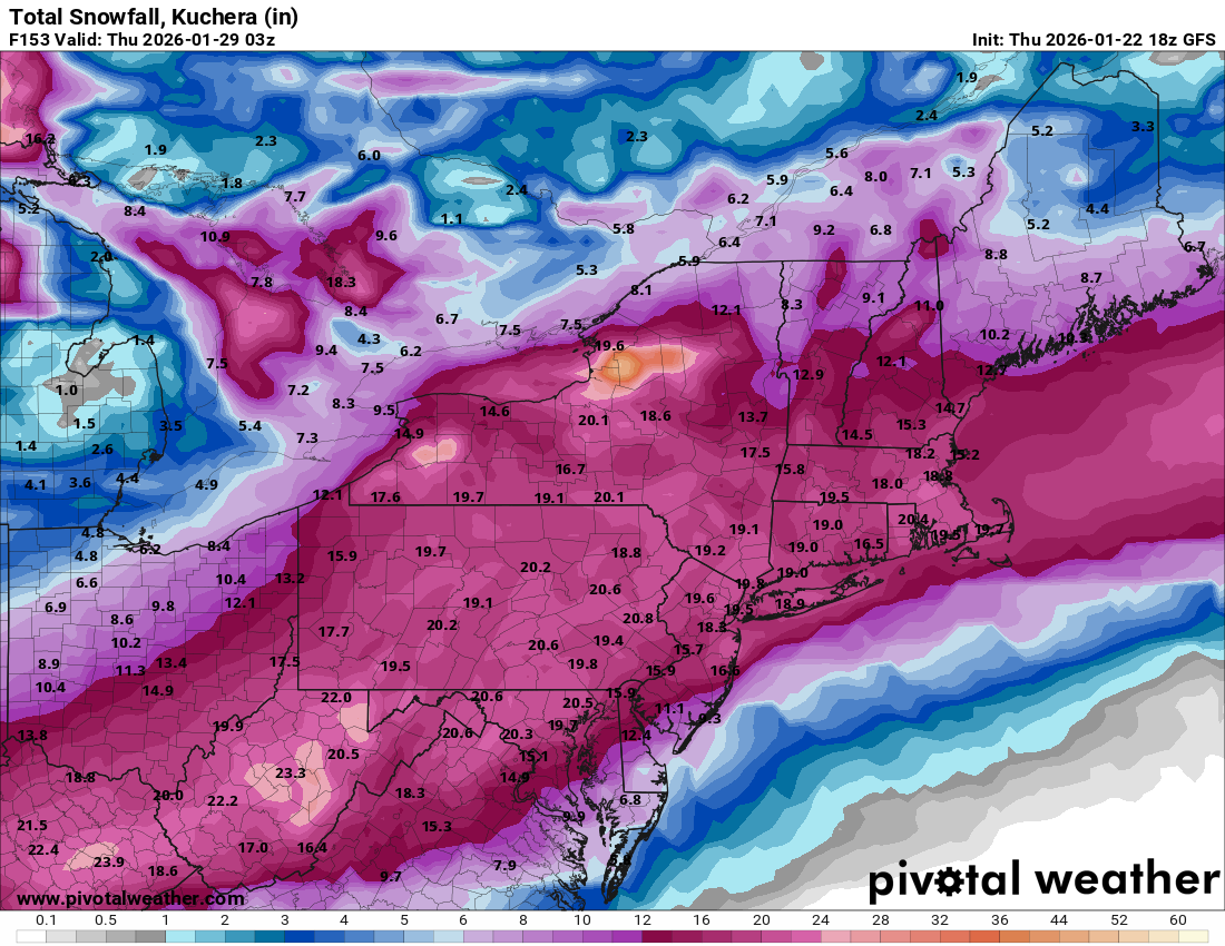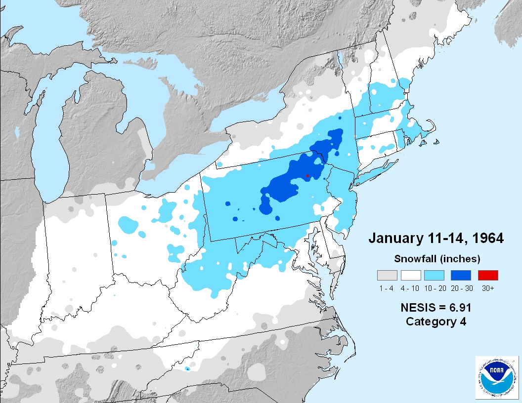 If the GFS is right, we will easily see this storm rank way up there on the NESIS scale. Below is Jan 1964 which is 8th on the list. And this storm could have an even more widespread 10"+ swath. Just something fun to think about. What really makes or breaks how high up these storms get on the NESIS list is how much snow DC, Philly, NYC, and Boston proper get. Because the NESIS equation specifically takes into account population AND how much snow said populations get