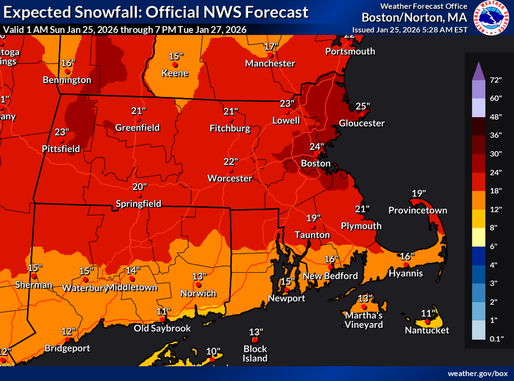 What could make this a really great storm in Boston vs very good but not one of the greats is whatever happens on Monday with the coastal low. They'll also get assist from the coastal front. Pretty confident Boston gets at least 15" and good shot at 18. If the Monday snow happens they have a shot at over 20. -