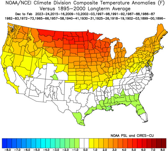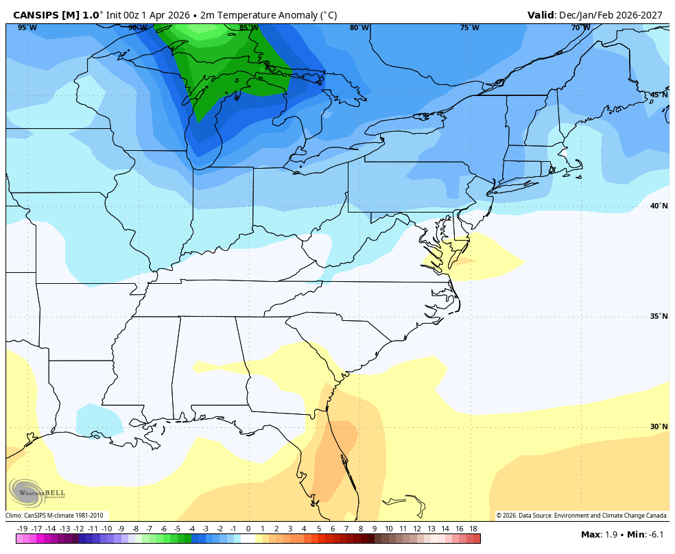 The new Cansips has winter anomalies significantly colder in the NE than the SE: For all of the Ninos peaking at +1.5+, not a single one going back at least to 1895-6 had a colder NE than SE anomaly wise! Not even one! These are the winters: 2023-4, 2015-6, 2009-10, 2002-3, 1997-8, 1991-2, 1987-8, 1986-7, 1982-3, 1972-3, 1965-6, 1957-8, 1940-1, 1930-1, 1925-6, 1918-9, 1902-3, 1899-00, and 1896-7. That’s 19 winters, a nice sample size suggesting the CANSIPS E US winter temp. anomalies and a strong El Niño prog aren’t at all jibing with history. Here is the aggregate of those 19 winters: