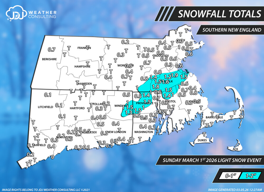 Snowfall totals from this light snow event. Went C-2 statewide, probably could have easily done C-1 and it would have been better with just a couple reports around Killingly area over 1".